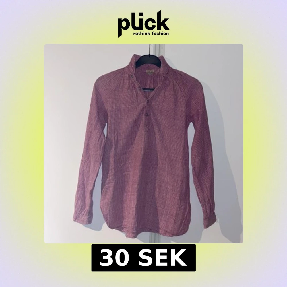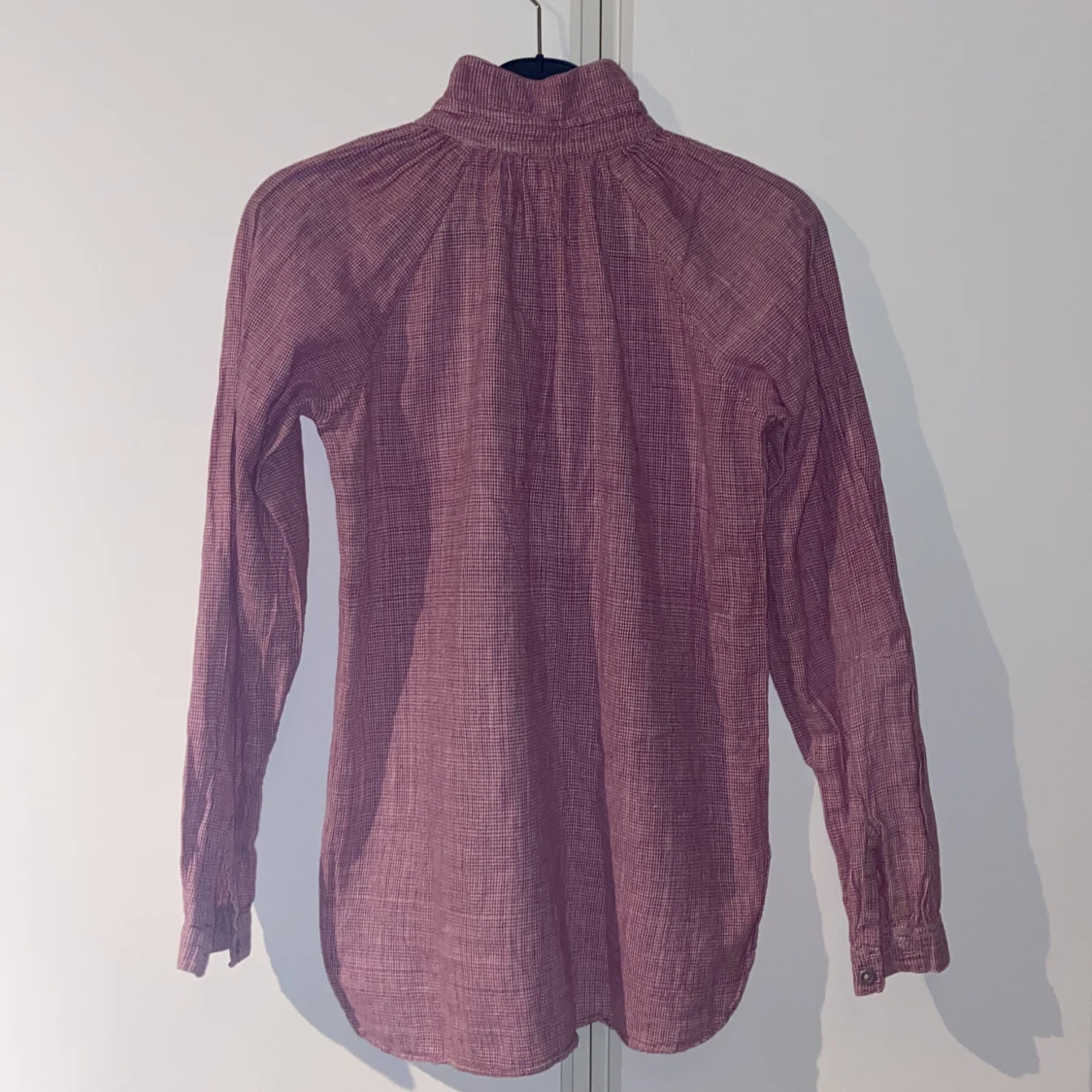 Röd skjorta/blus med lång ärm och knappar framtill. Skjortan har ett diskret rutigt mönster. Finns en lagning på ena armbågen och är lite sliten i övrigt.
