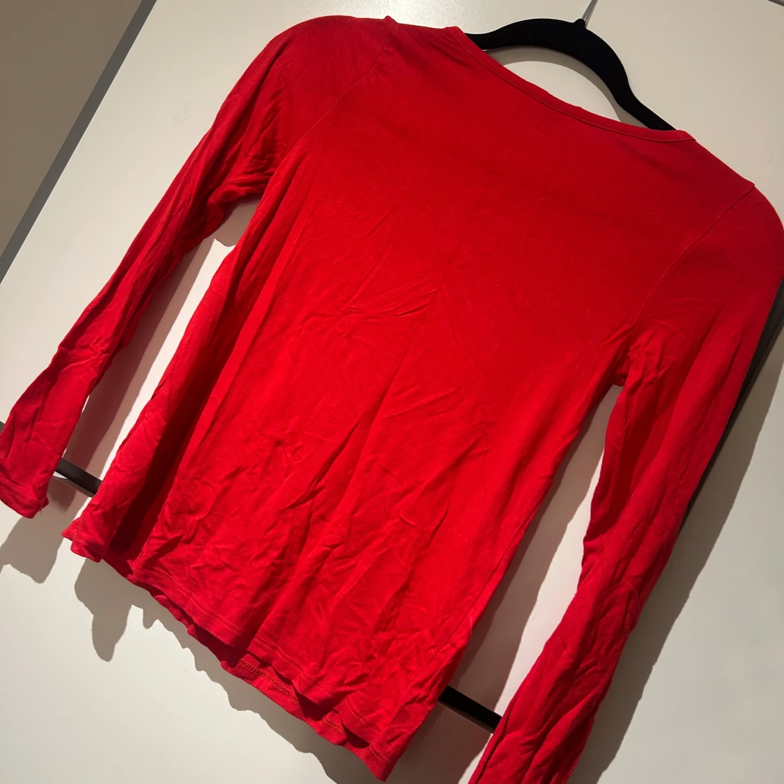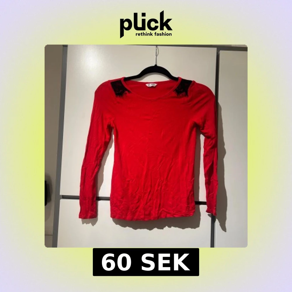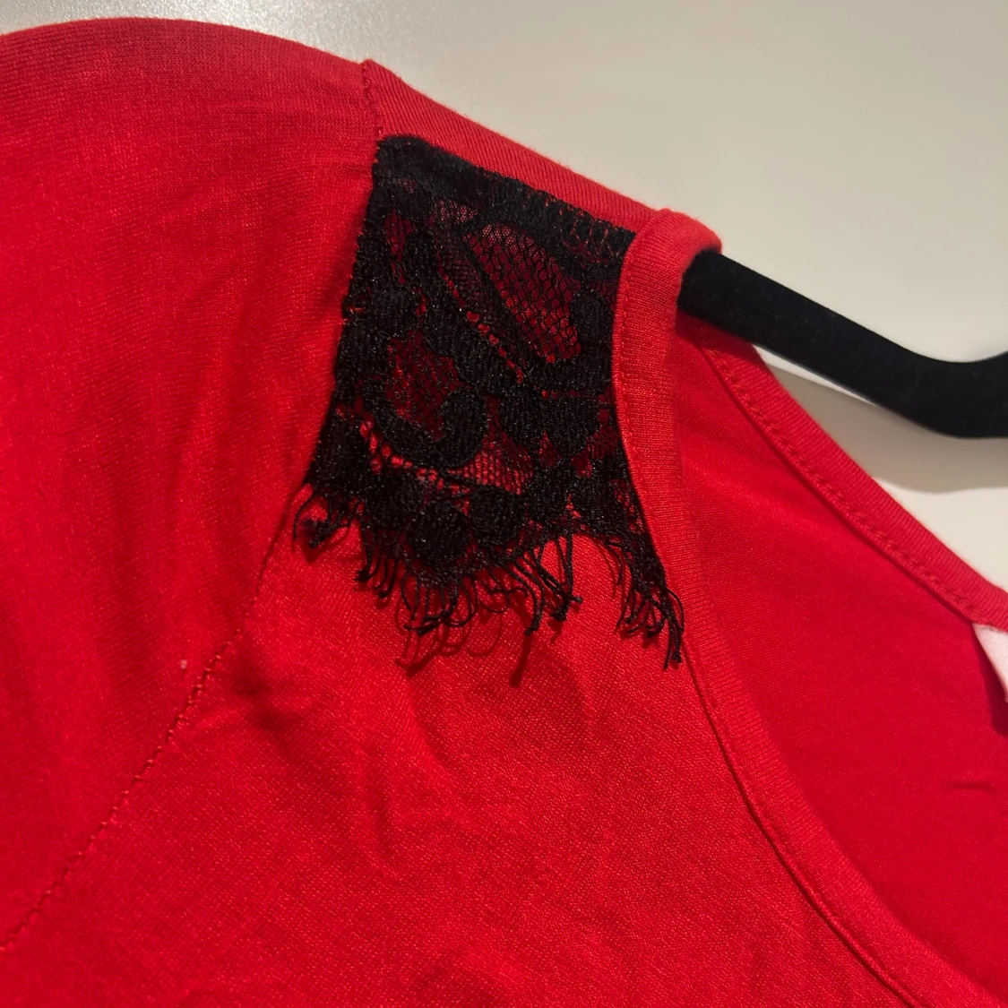 Snygg röd långärmad topp med svarta spetsdetaljer vid axlarna. Toppen har en rund halsringning och är tillverkad i ett mjukt material.