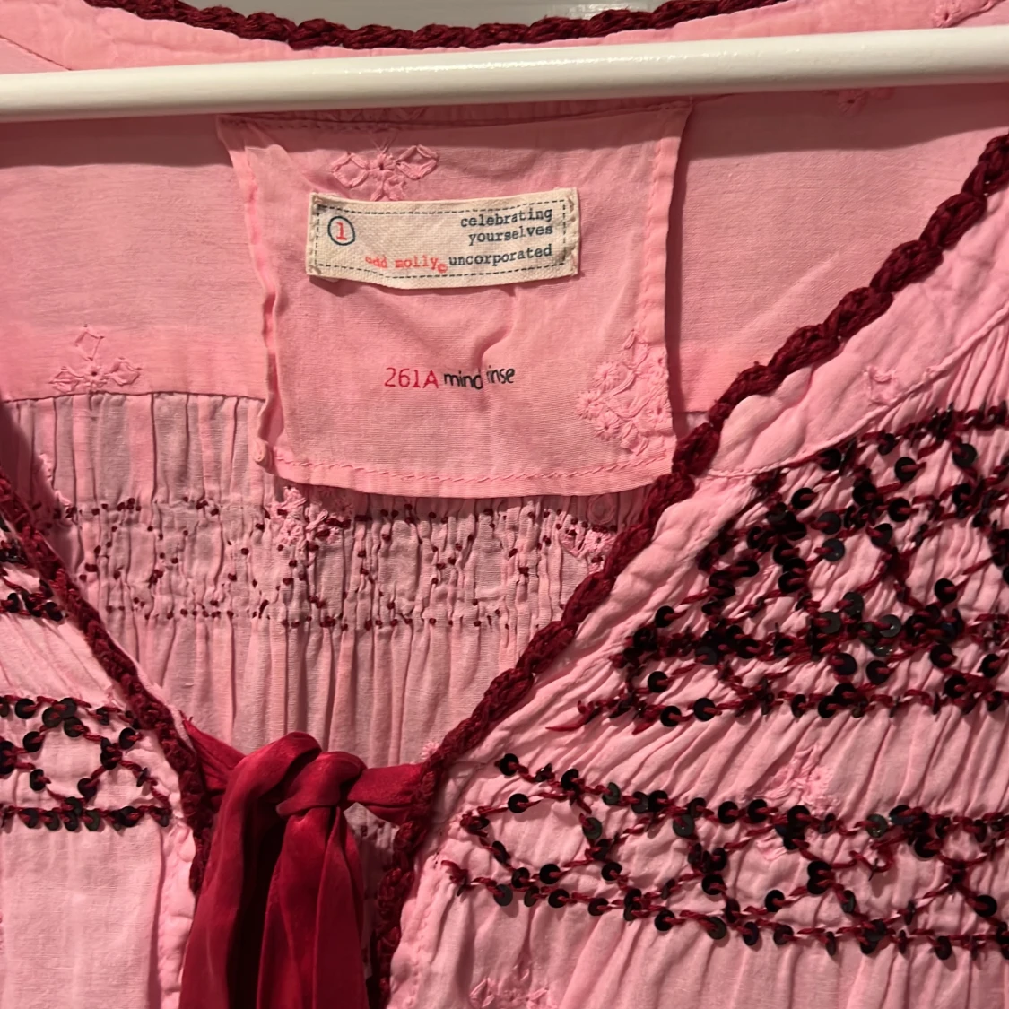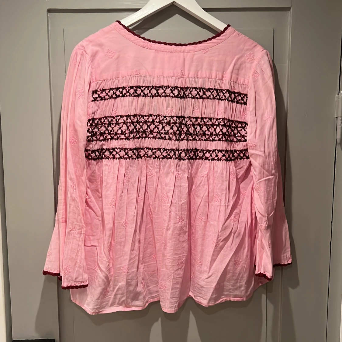 Lite skrynklig men härligt rosa blus med glittriga paljettdetaljer som passar utmärkt till att pigga upp höstmörkret. Vid modell, storlek 1.
