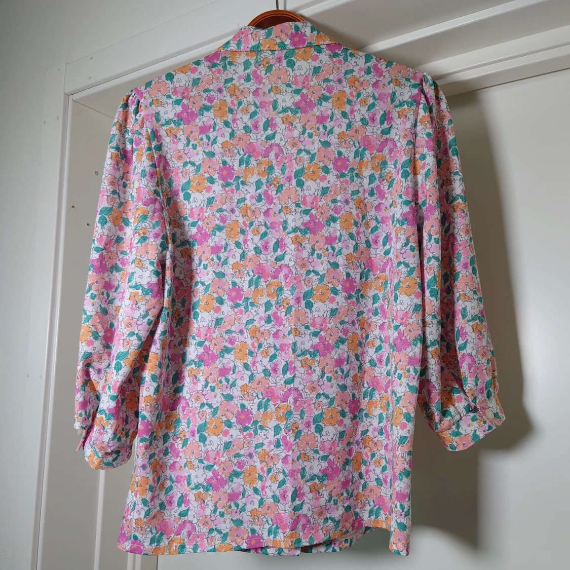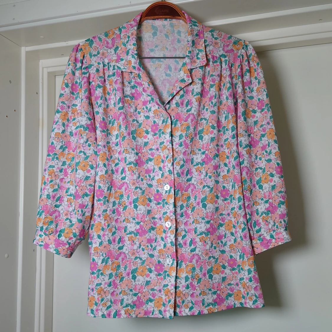Blommig vintageblus, väldigt skön att ha på sig. Ingen storleksmärkning men bör vara en L💐