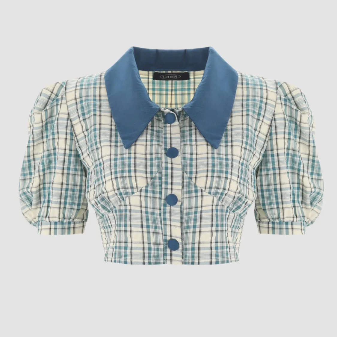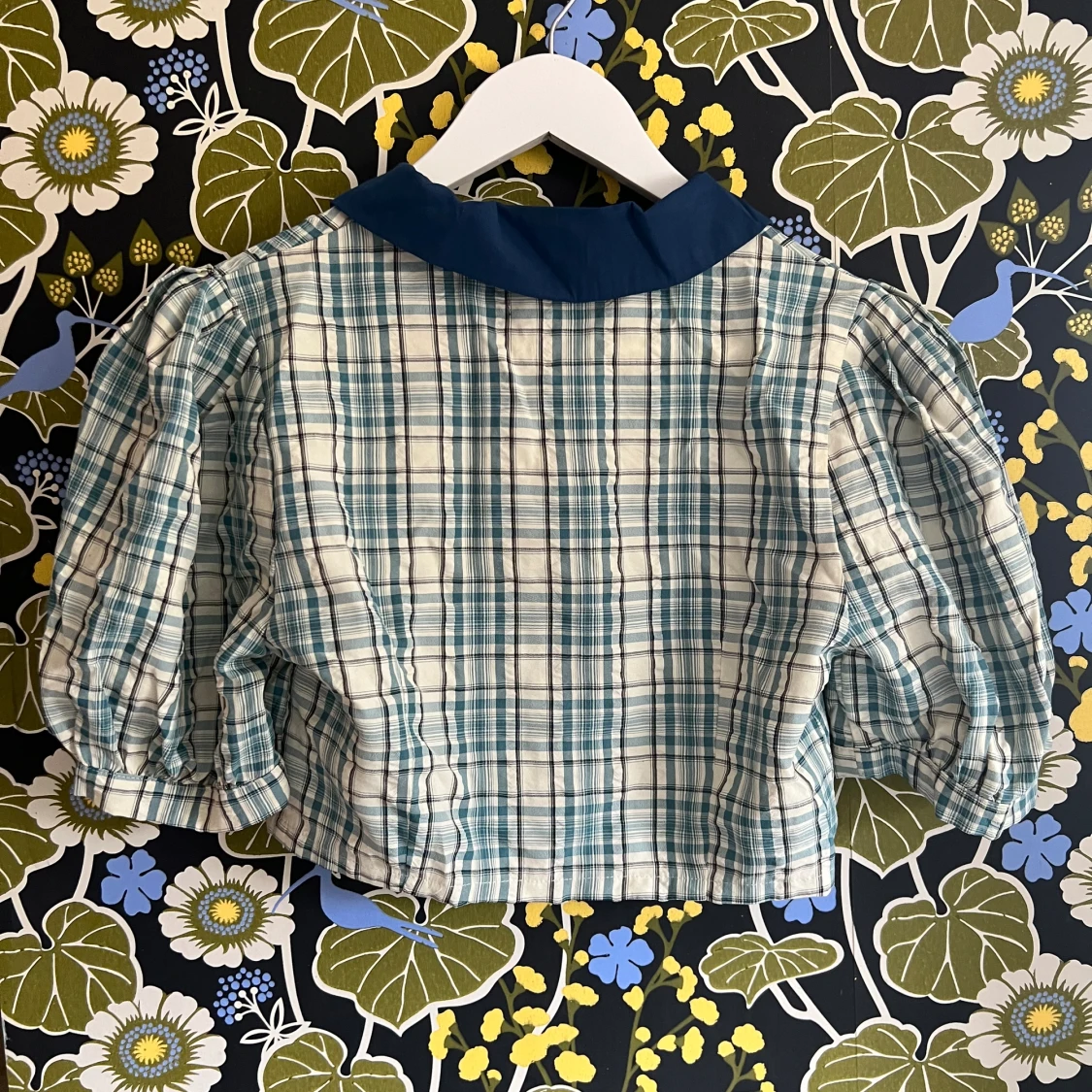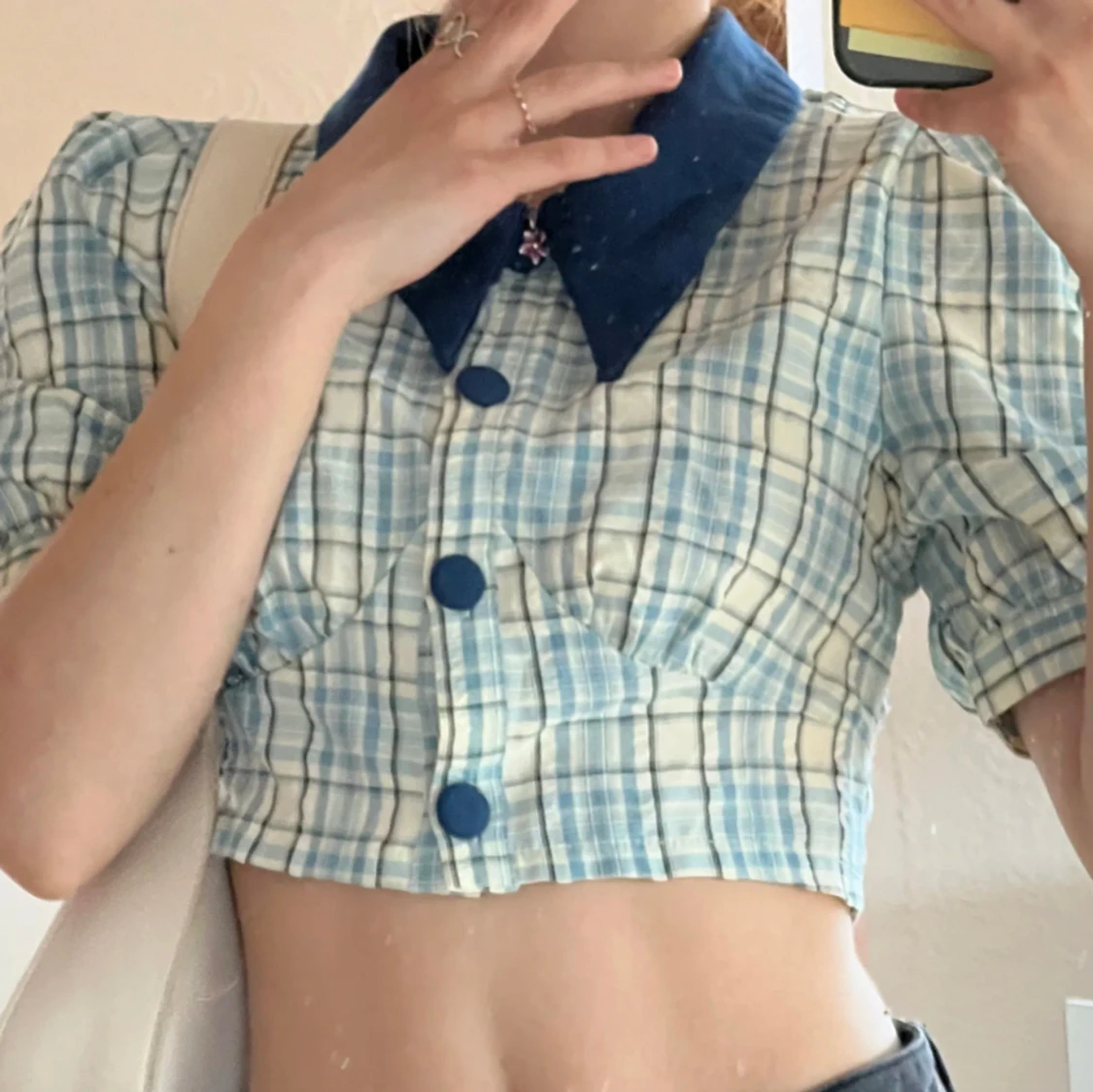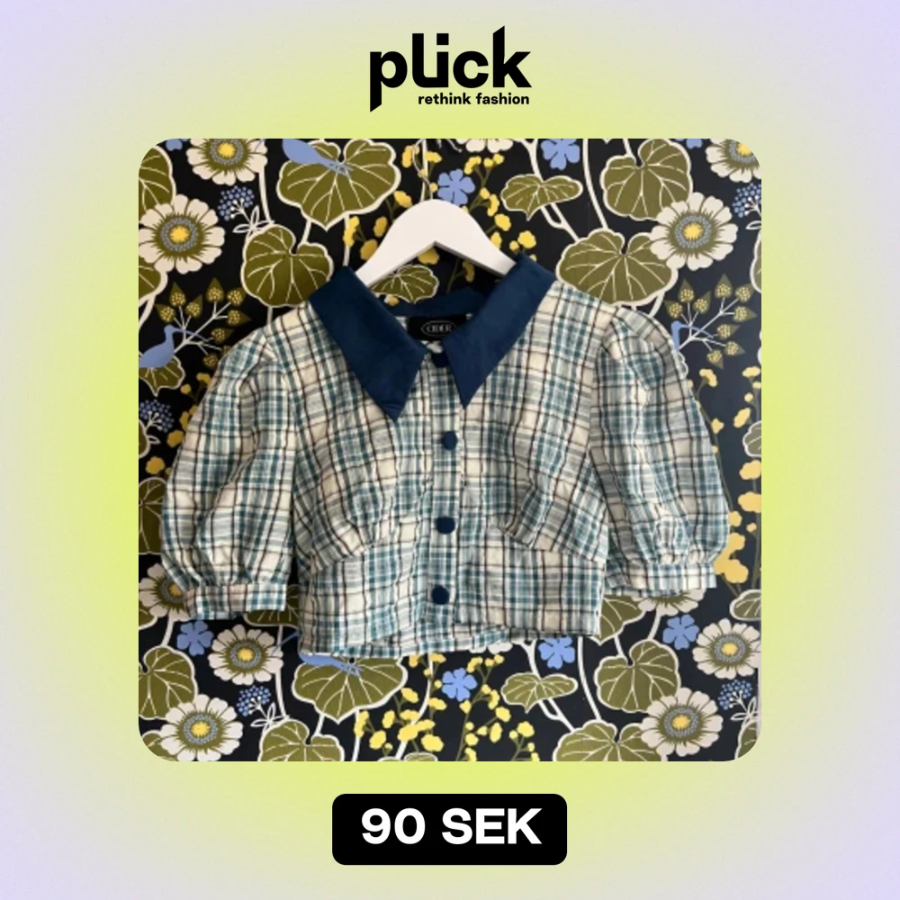 Blårutig croppad blus med krage och knappar Storlek S men har funkat för mig som är M också. En av knapparna är lite intryckt men det är inget som påverkar tröjan och man ser det inte när man använder det, men därav priset! Nypris 200 kr