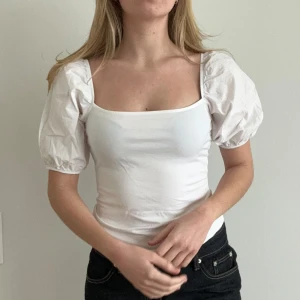 Säljer en stilren vit blus med puffiga kortärmar och fyrkantig urringning. Perfekt för en chic och modern look. Passar bra till både jeans och kjol.