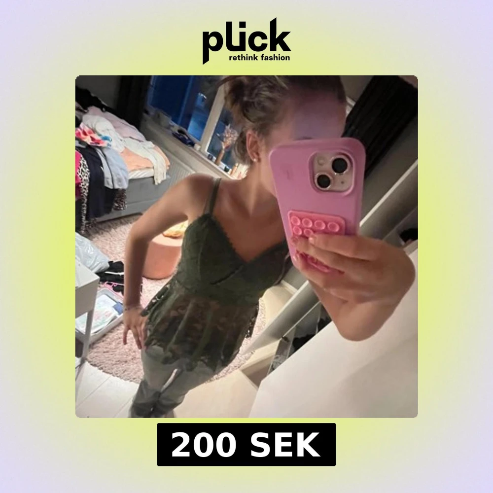 Säljer en mörkgrön linnetopp med spets och omlott-design. Toppen har smala axelband, v-ringad hals och transparent spets nedtill som ger en snygg och feminin look. Perfekt att styla med jeans eller kjol för en trendig vibe. Har använt få gånger.