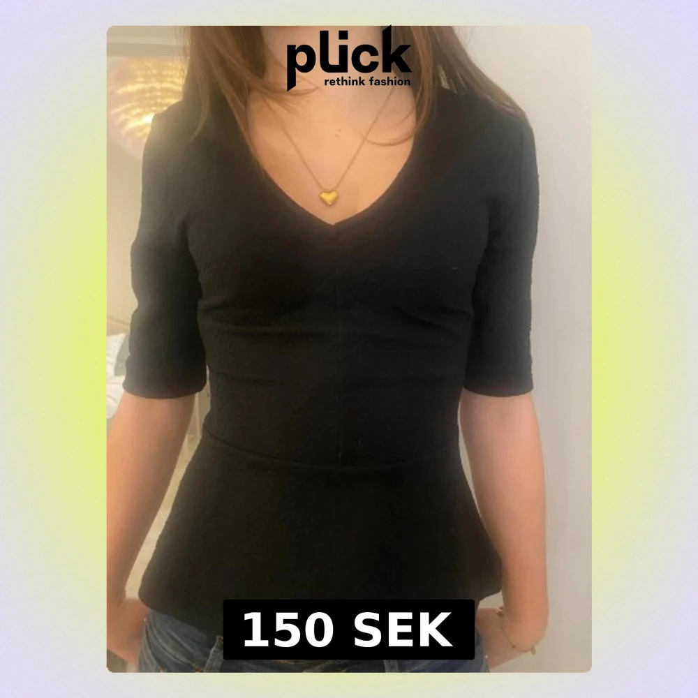 Snygg svart blus med v-ringning och trekvartsärmar. Modellen är figurnära upptill och har en lätt utsvängd nederdel som ger en cool siluett. Materialet är strukturerat och känns mjukt mot huden. Perfekt att styla med jeans eller kjol för en trendig look. Skriv för fler bilder och mått💞