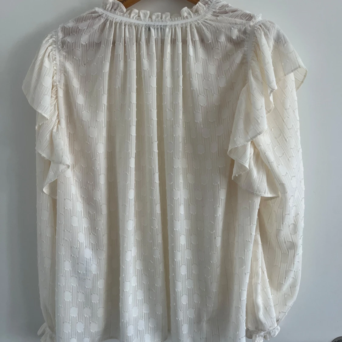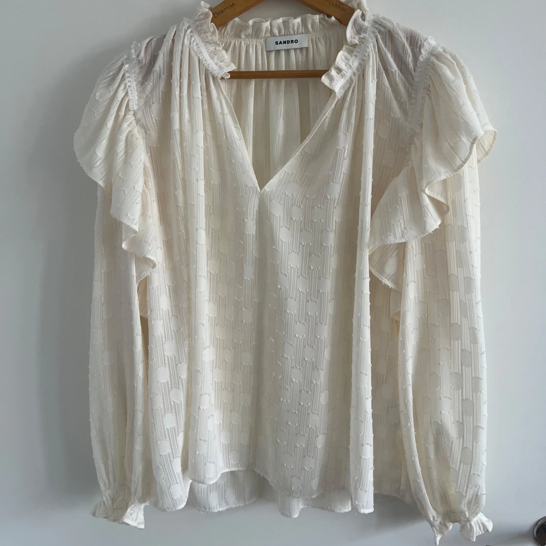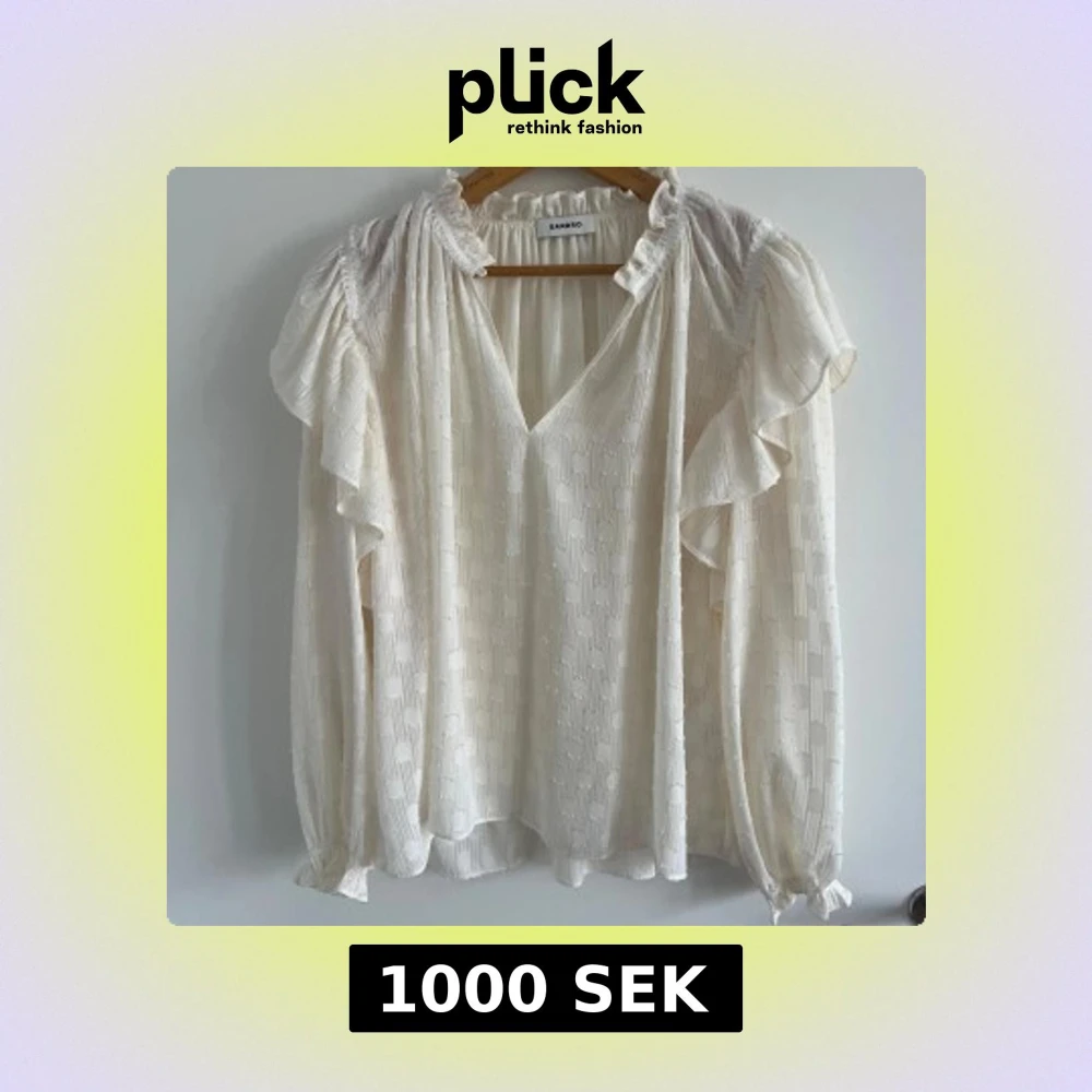 Supersöt vit blus från Sandro med volangdetaljer på axlarna och kragen. Blusen har v-ringning, lång ärm med resår vid ärmslut och ett subtilt strukturerat mönster i tyget. Luftig och flowy känsla, perfekt för att lyfta din stil.