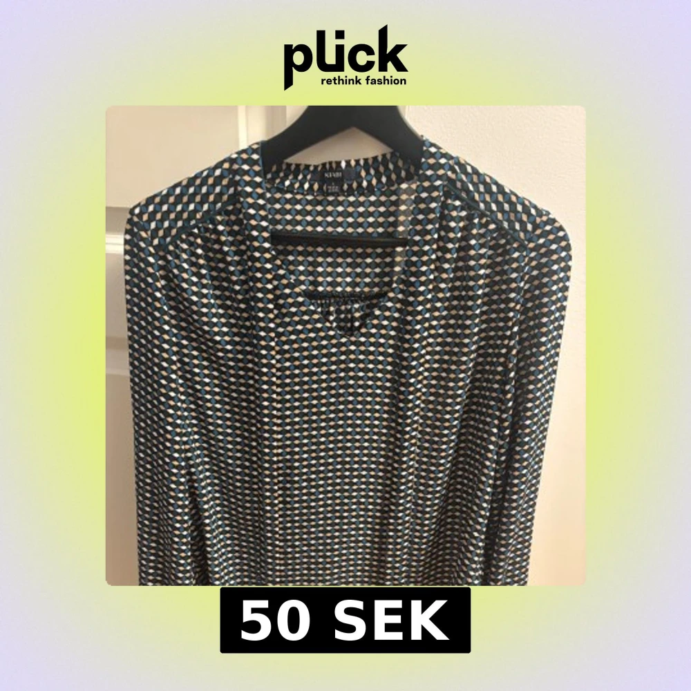 Säljer en snygg blus från KIABI i storlek S med geometriskt mönster i blått, beige, vitt och svart. Blusen har v-ringad hals och knytdetalj framtill. Materialet är mjukt och känns som polyester, perfekt för dig som gillar färg och grafiska prints.