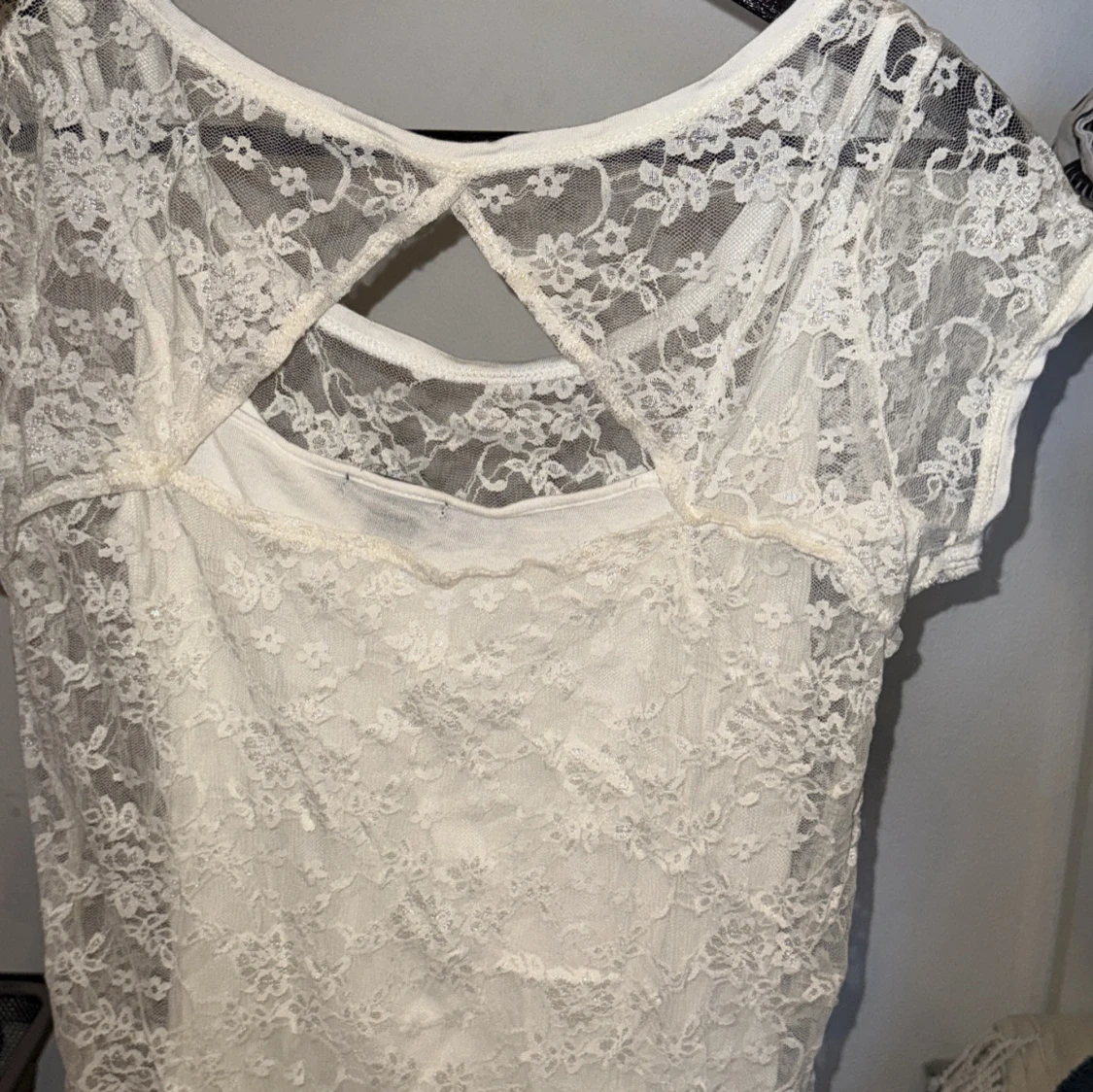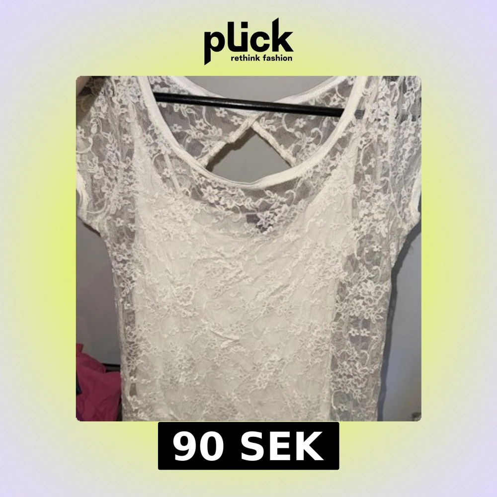 Säljer en vit tröja med blommig spets och snygg öppen ryggdetalj. Blusen har korta ärmar och ett tunt innerfoder som gör den bekväm att bära. Perfekt för dig som gillar romantisk och feminin stil med extra detaljer.