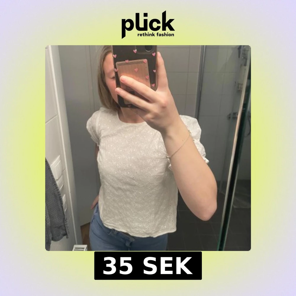 Säljer en söt vit blus med spetsdetaljer och korta puffärmar. Perfekt för en somrig look. Blusen har en rund halsringning och en knapp i ryggen för enkel påklädning. Passar bra till både jeans och kjol! Går att pruta. Liten ljusgul fläck som man knappt ser som ni ser på bilderna. Står ingen storlek men skulle säga s. Köpt här på Plick så vet ej vilket märke det är då det inte står i