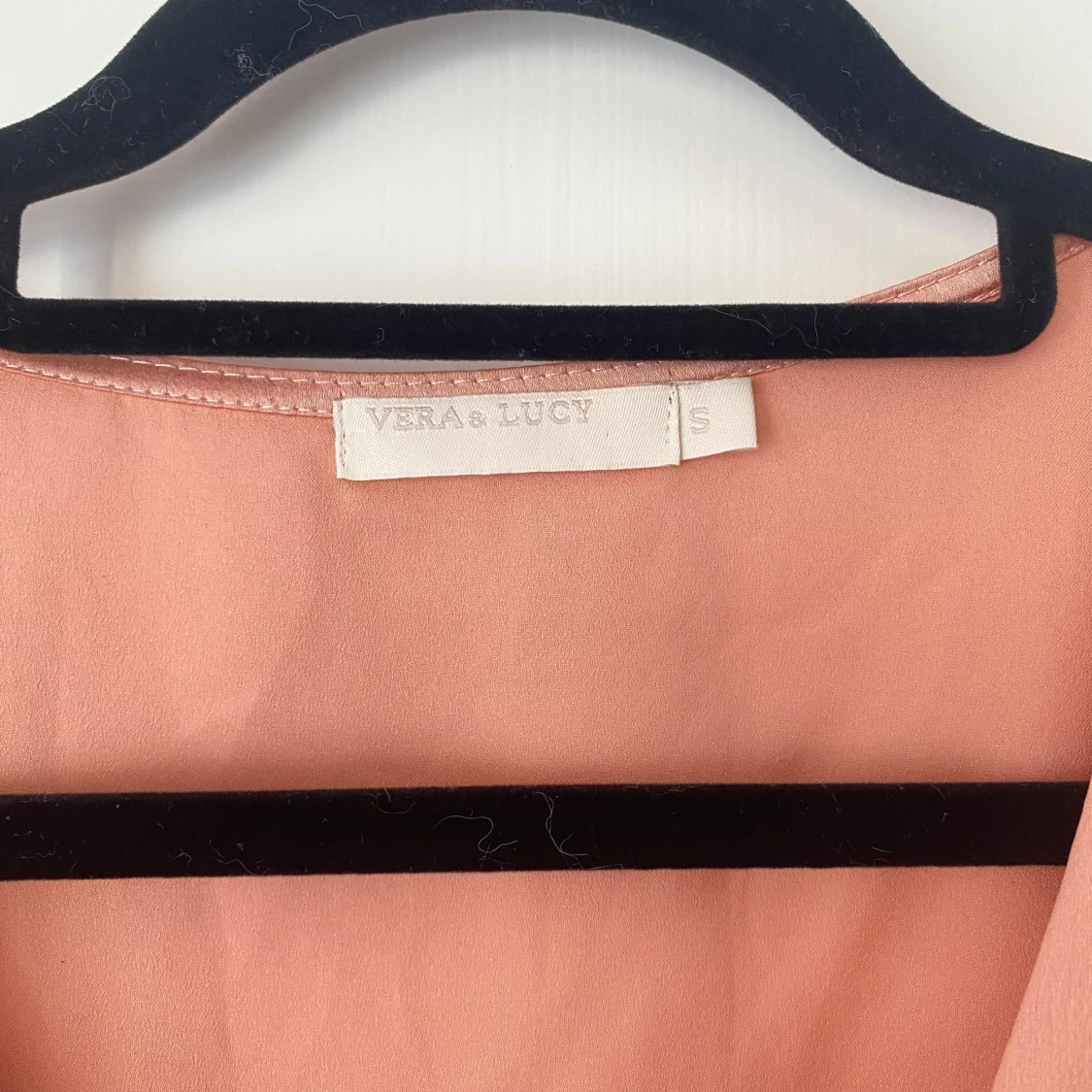 Elegant persikofärgad blus i satin med v-ringning och långa ärmar. Blusen har en fin rynkdetalj framtill och volang vid nederkanten. Perfekt för en stilfull look.