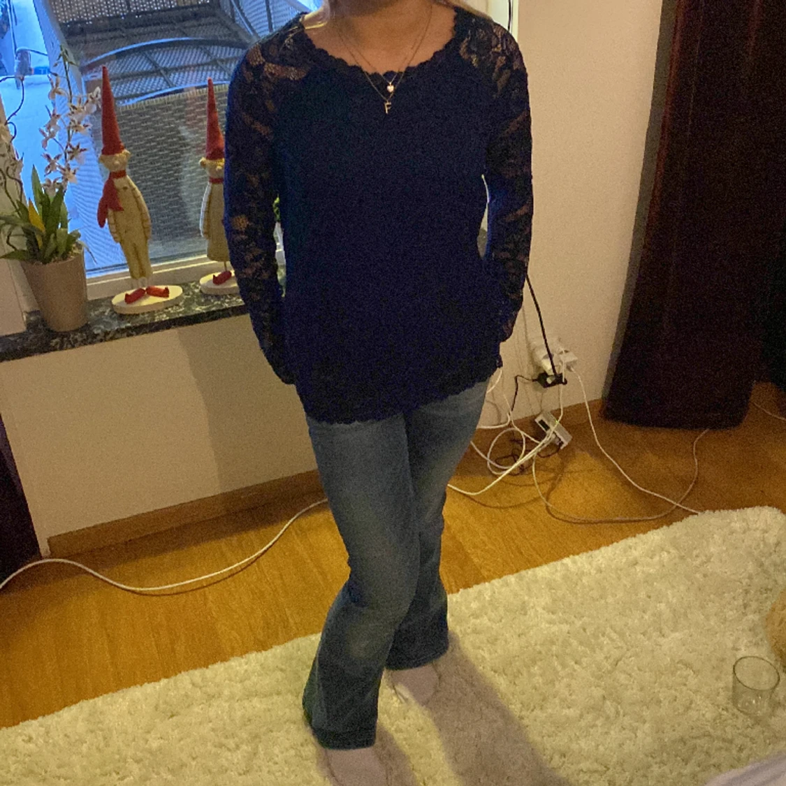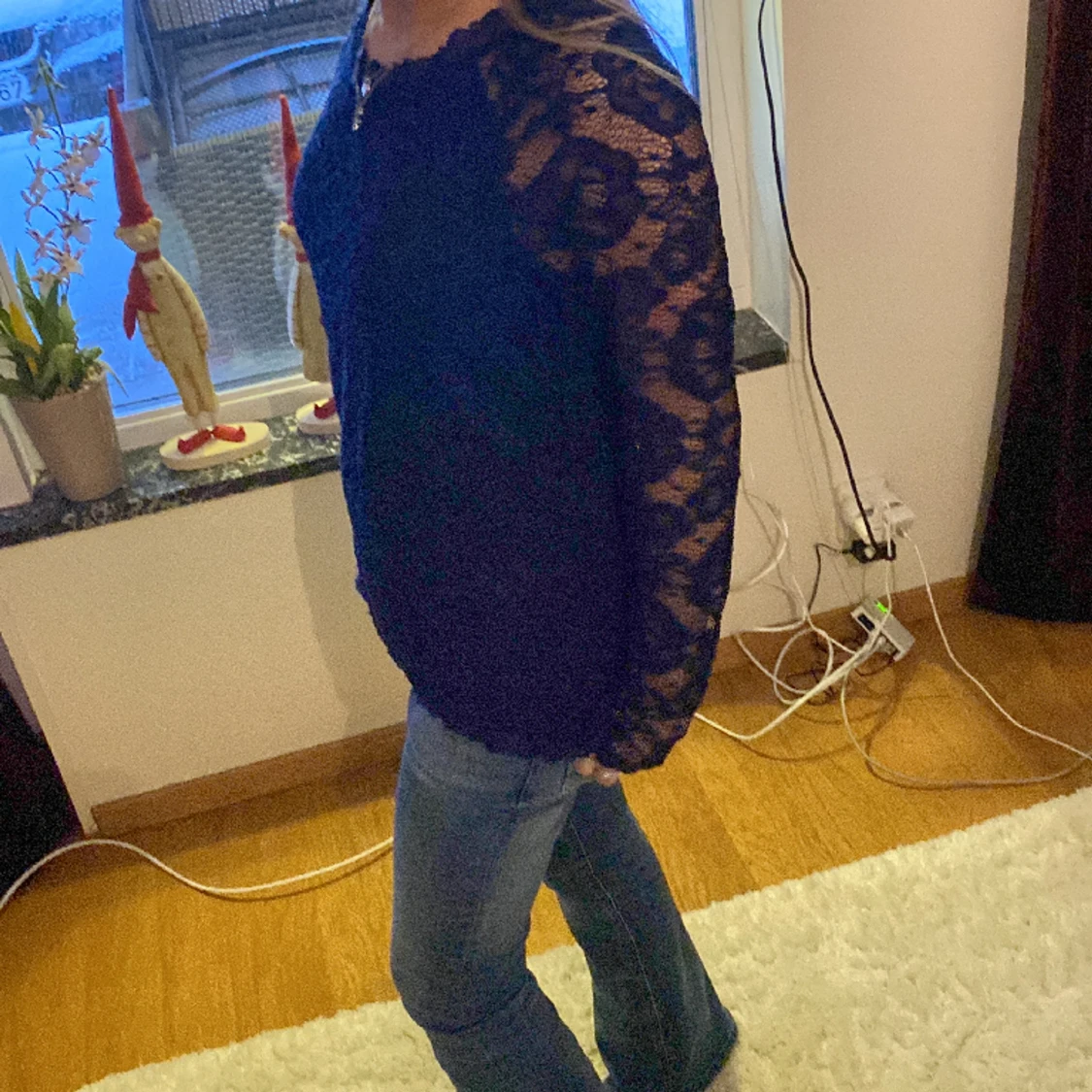 Super snygg långärmad marinblå spetströja. Säljer för att jag tycker den ör lite stor.