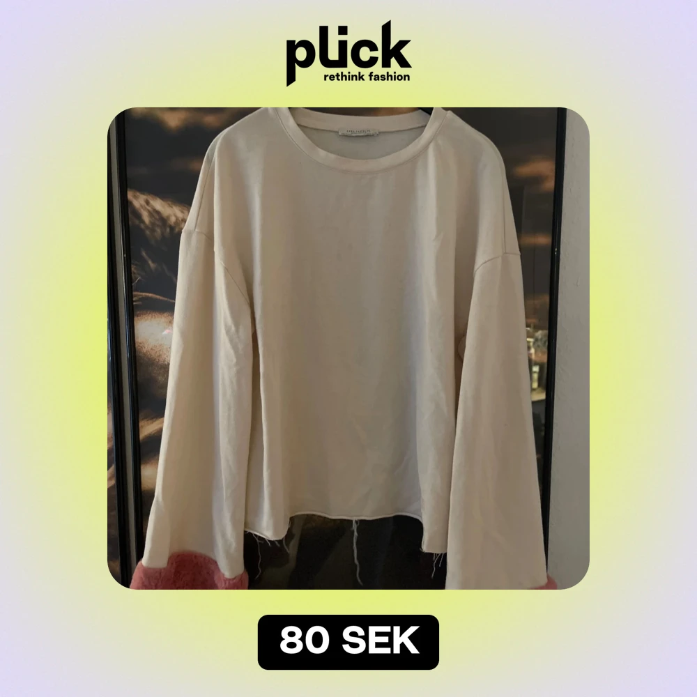 Säljer en vit tröja från ZaraDen har långa ärmar och en croppad passform med en unik rosa detalj vid ärmsluten. Perfekt för en avslappnad stil eller att klä upp med accessoarer. Superbekväm och stilren!