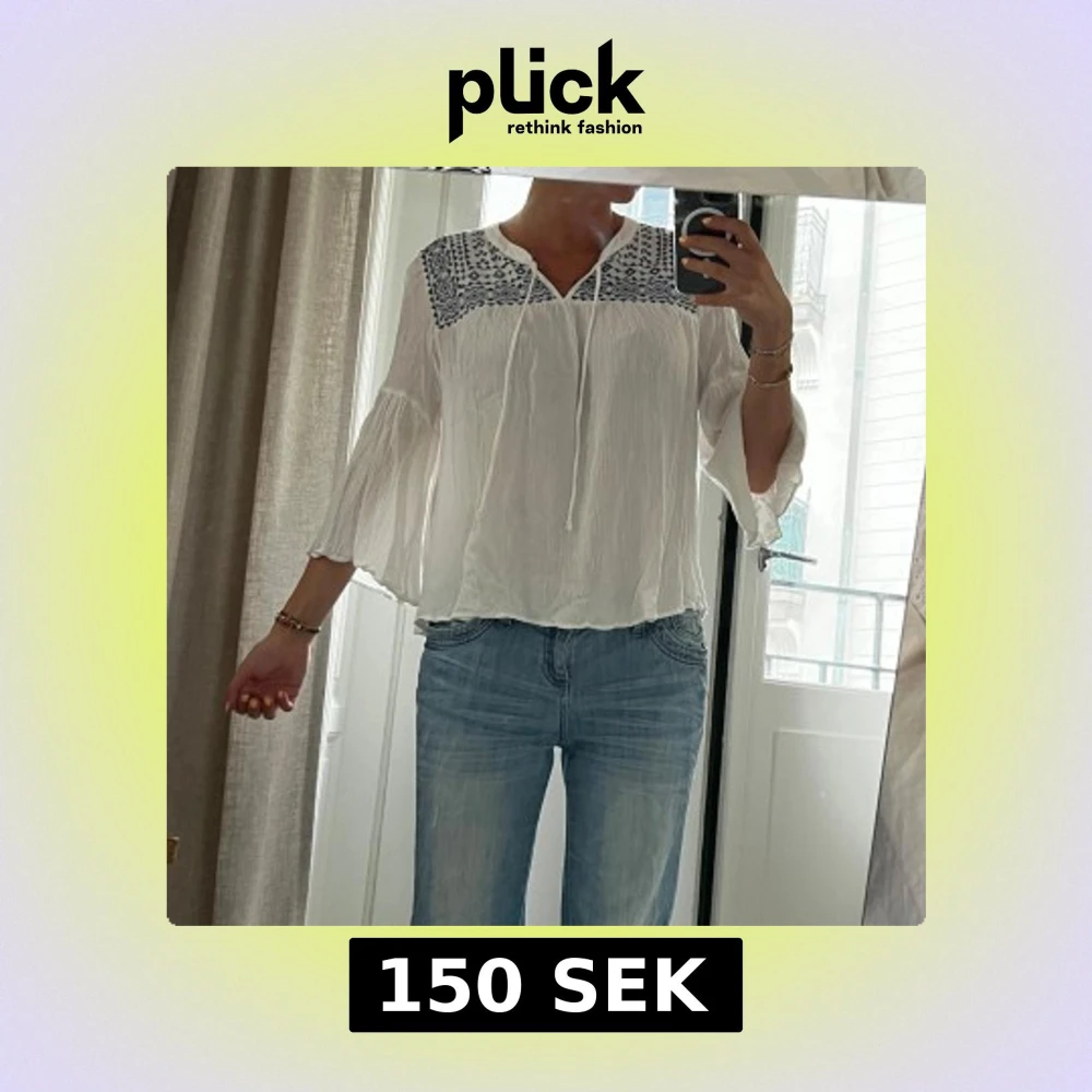 Söt blus från indigo, med blå broderi upptill. V-ribgad krage med snörning. Storlek xs/s.