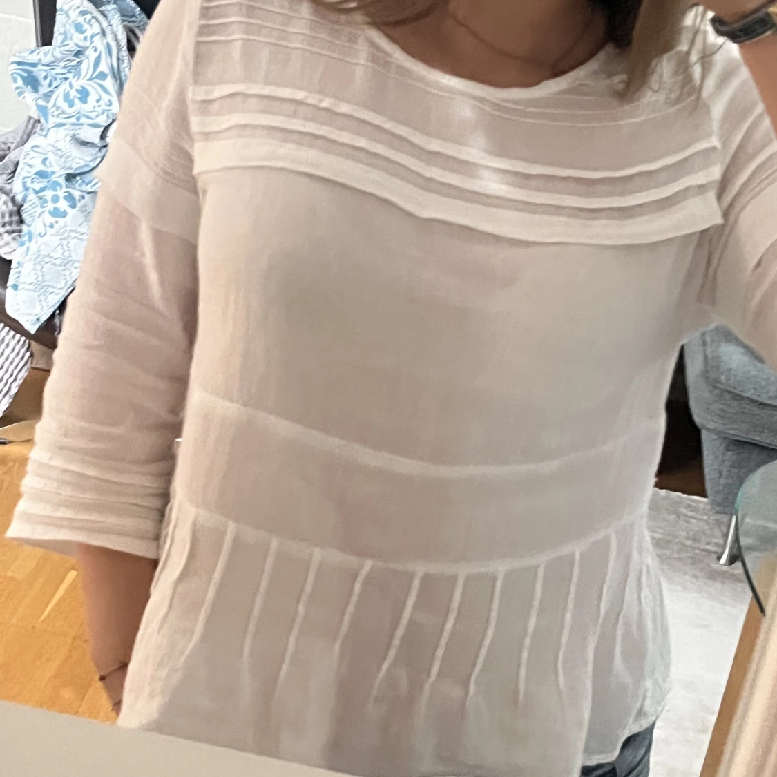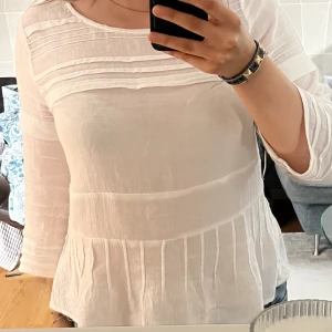 En trekvartsärmad blus i vit färg och fina detaljer💕 använd 3 gånger och har en liten fläck på framtiden av tröjan.