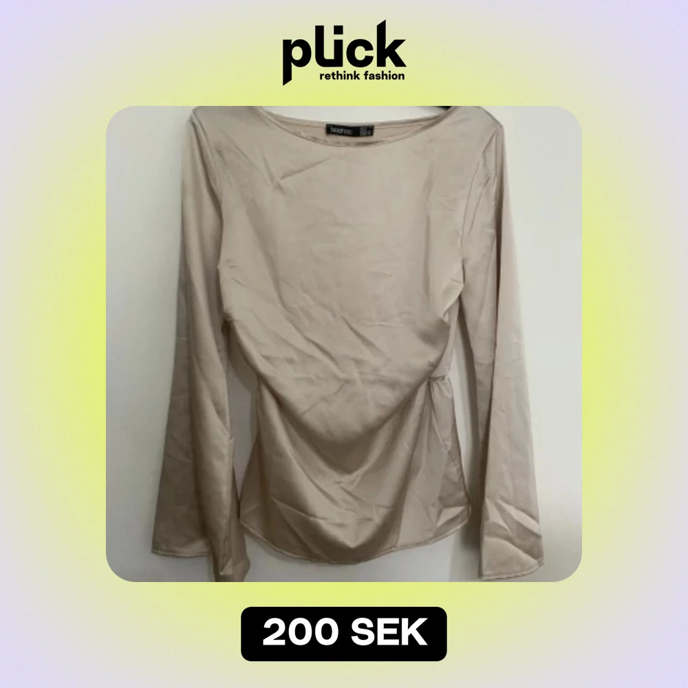 BEIGE SATIN TOPP LÅNGÄRMAD BLUS - Hej! Säljer denna så snygga satin tröja ifrån Bohoo. Lapp kvar, aldrig använd. Storlek 34. Den går utåt vid ärmarnas slut och har reså i midjan som formar kroppen. Helt nyskick!
