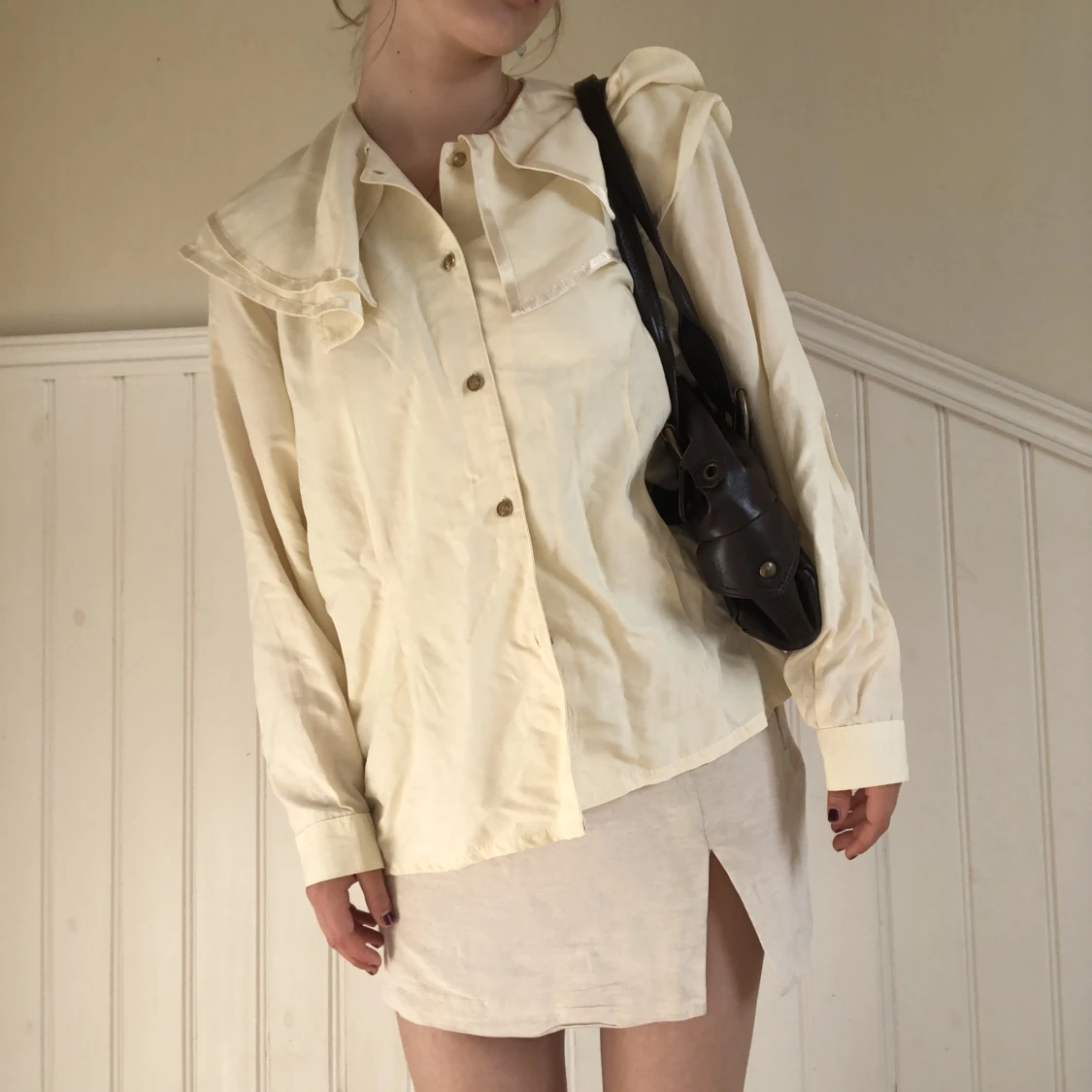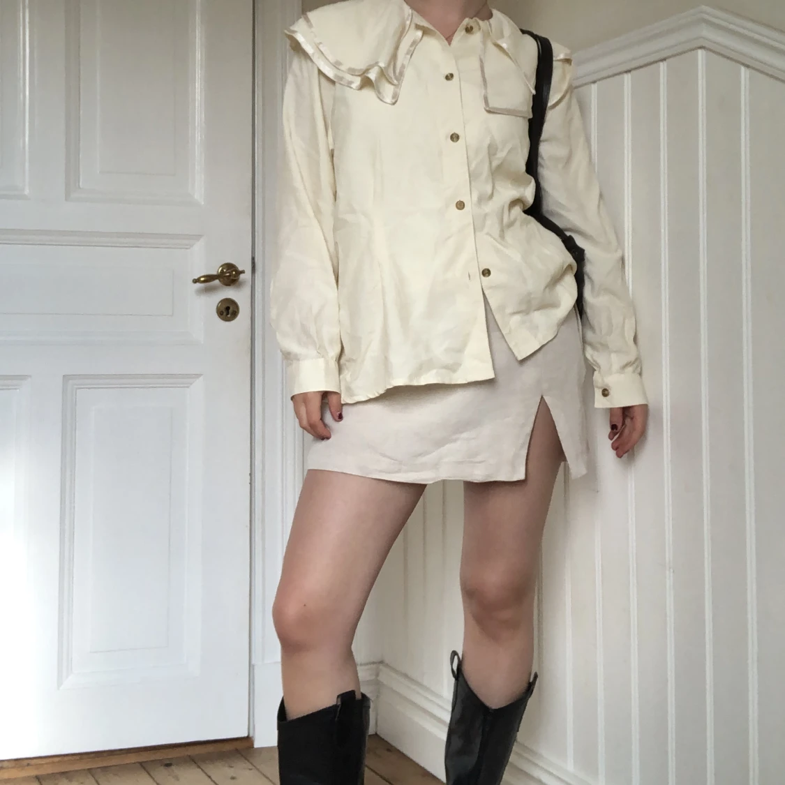 Söt krämvit blus köpt på second hand🌞strl L men passar en M. I jättebra skick, lyxig känsla