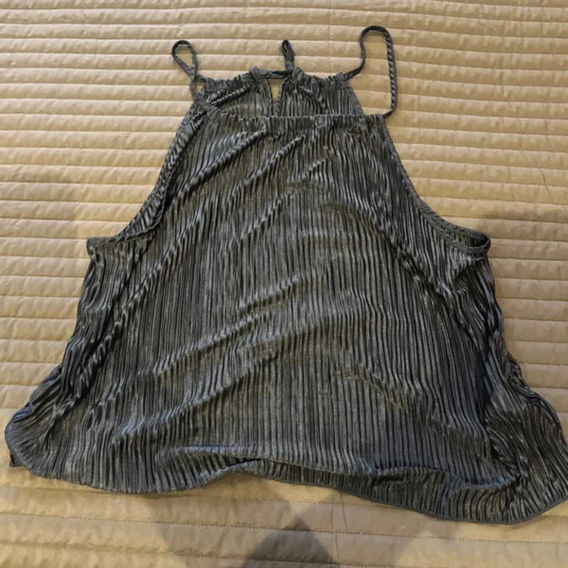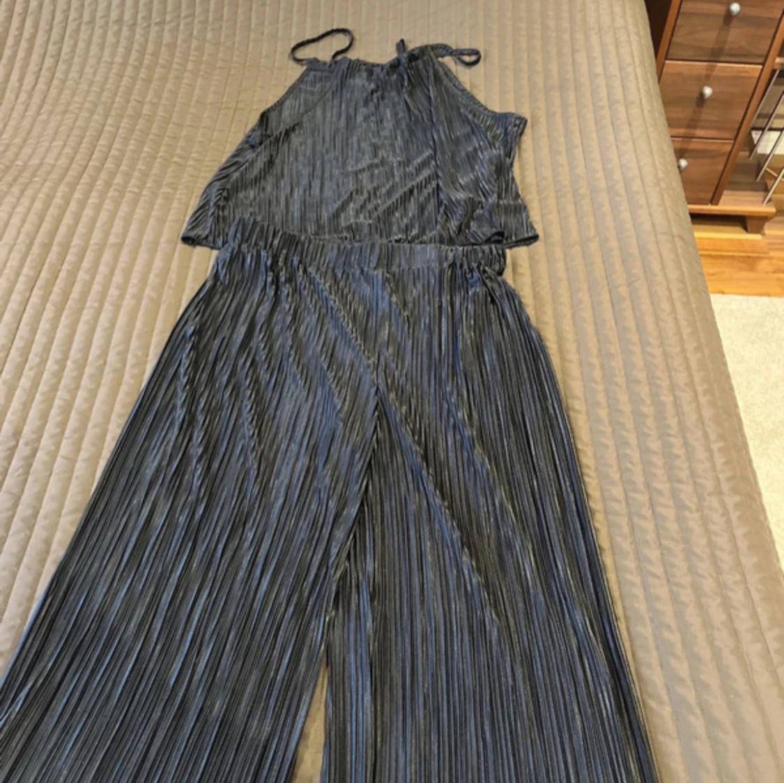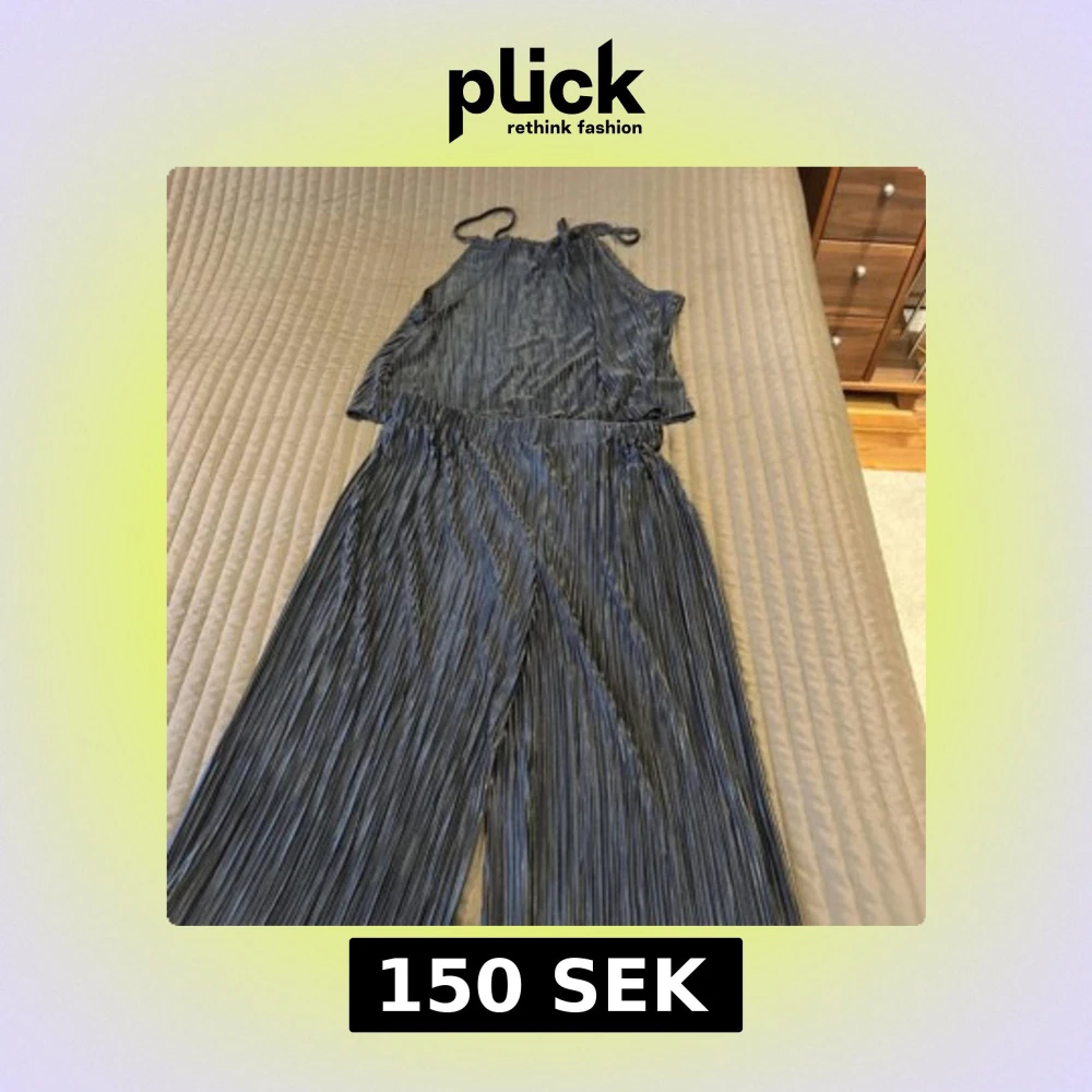 Snygg svart plisserad jumpsuit från Shein med halterneck och vida ben. Perfekt för en stilren look med en touch av elegans. Den har en glansig finish som ger en extra dimension till outfiten. Aldrig använd. Säljer för 150 kronor
