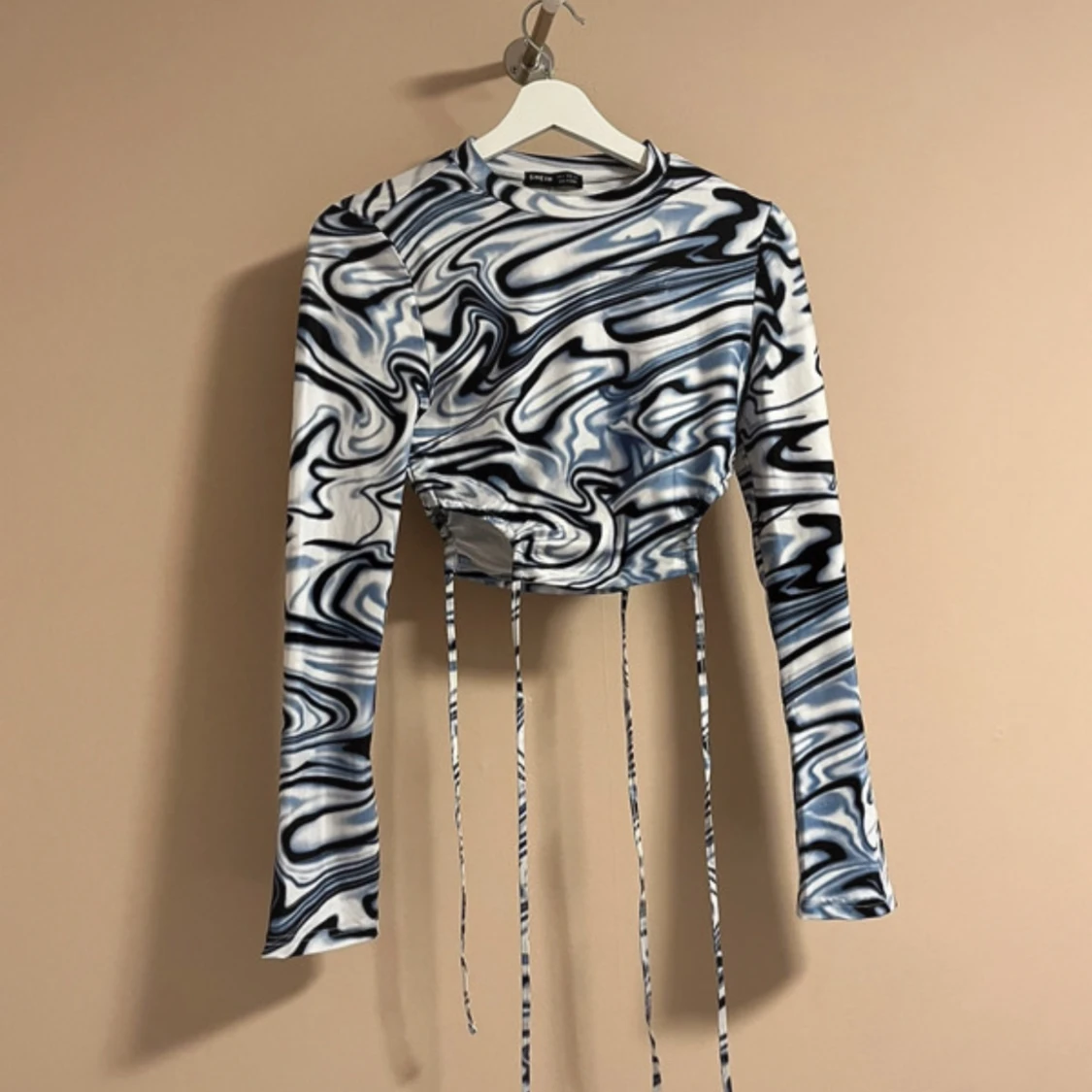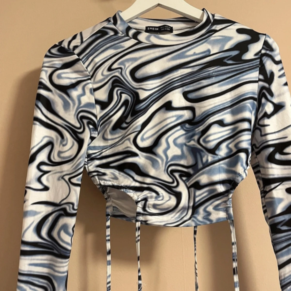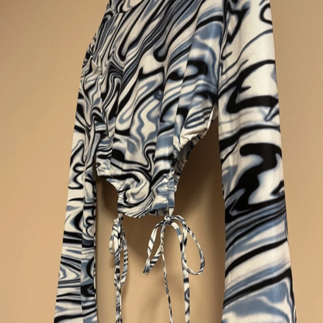 Använd 1 gång, mycket bra skick. En festlig tröja/långärmad topp, som man knyter i sidorna och midjan är synlig.