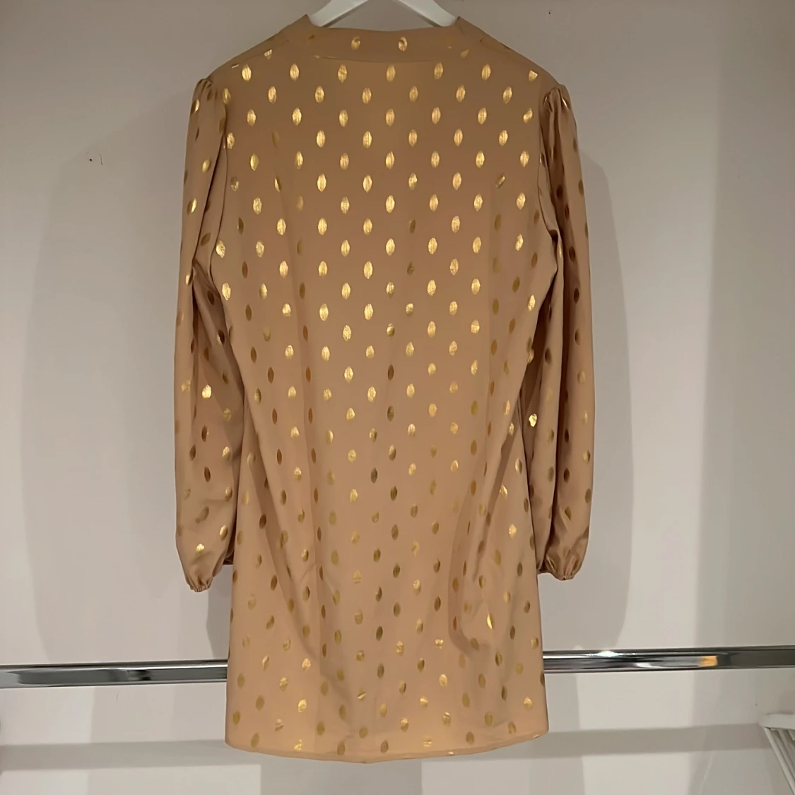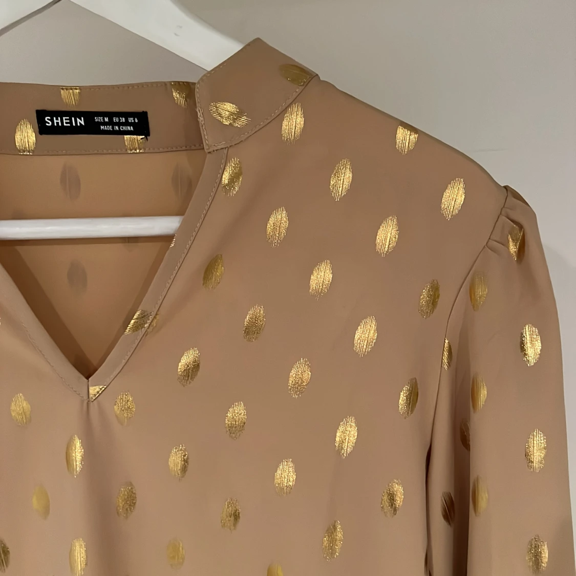 Beige tunika med gulddetaljer från Shein som matte aldrig använt trots att den är lika guldglänsande som min päls. 🐈😻Luftig med lång ärm och går ner till mitten på låret. Storlek M/38.