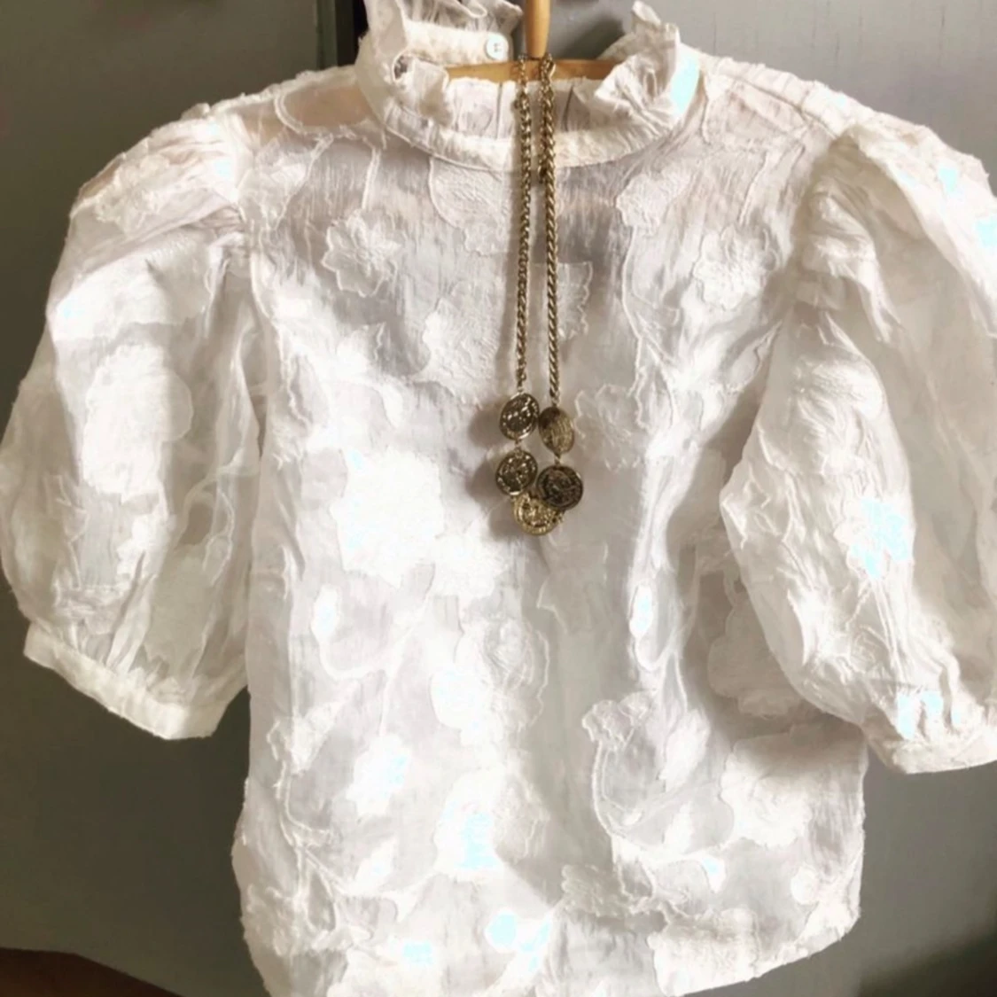 Jättefin blus med blommiga-spets detaljer och ballong ärmar 🤍 Storlek S, blusen har använts men bara ett fåtal gånger så den är i super skick!
