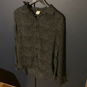 Fin och skön blus från h&m, den är svart blandat med mörkgrön och har vita prickar på. Den ser svart ut från långt håll men om man tittar noggrant i ljus ser den lite grön ut. Blusen är i storlek 40. Säljer denna blus för 90kr men kan sänka priset vid snabb affär!☀️