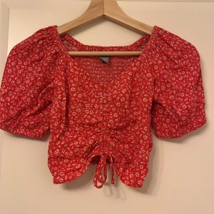 Uppfriskande röd blommig topp med lite puffärmar och justerbar längd. Är i storlek Xs men funkar säkert för S ockdå! Verkligen superfin nu till sommaren💕💕💕