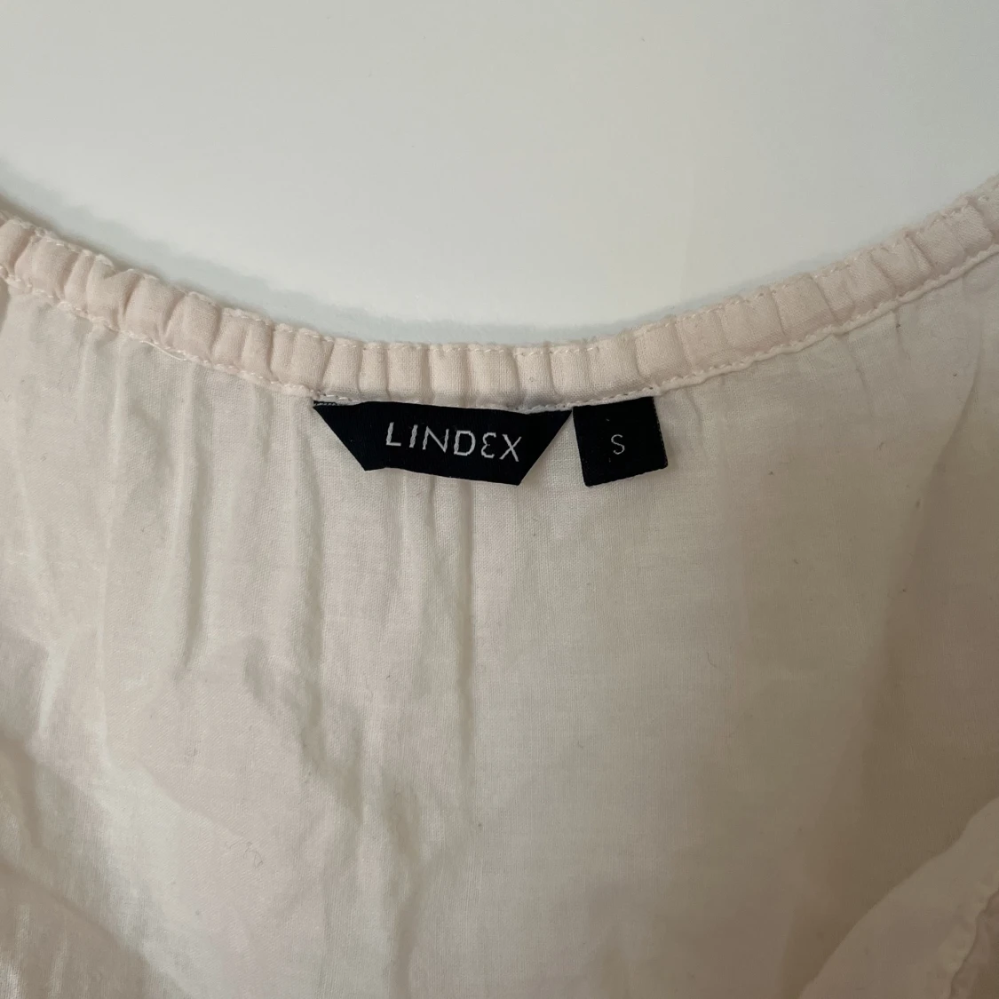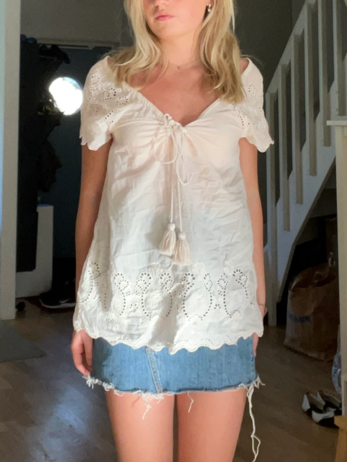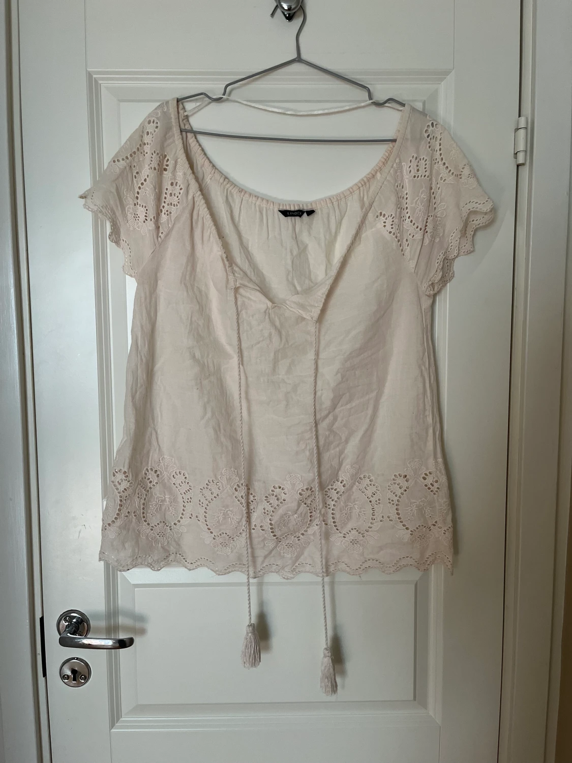 Jätte skön somrig vit blus med luftigt tyg. Står att det är storlek S men skulle säga att den är mer M/L