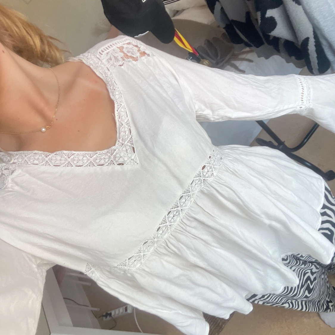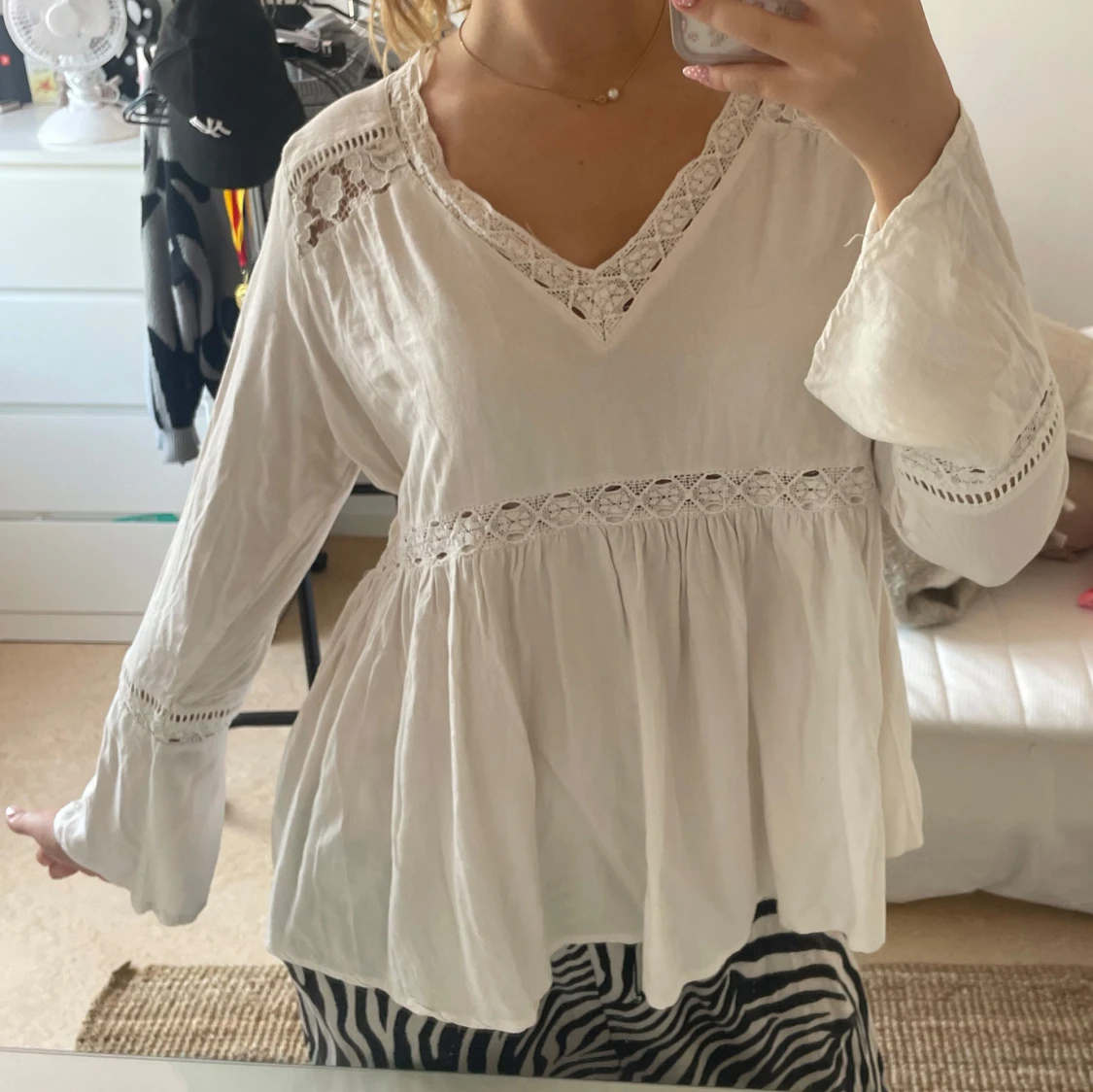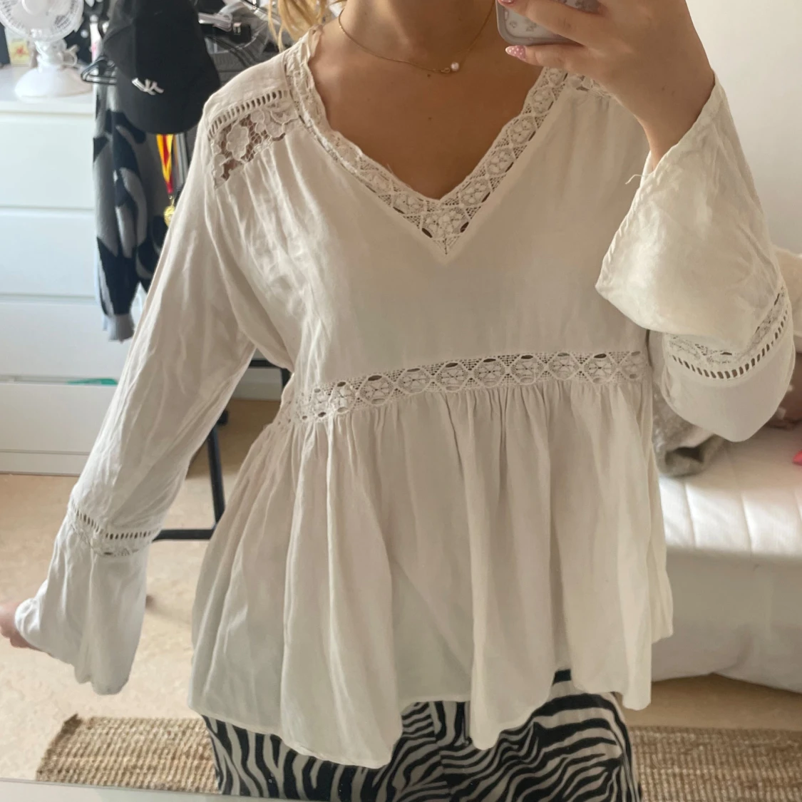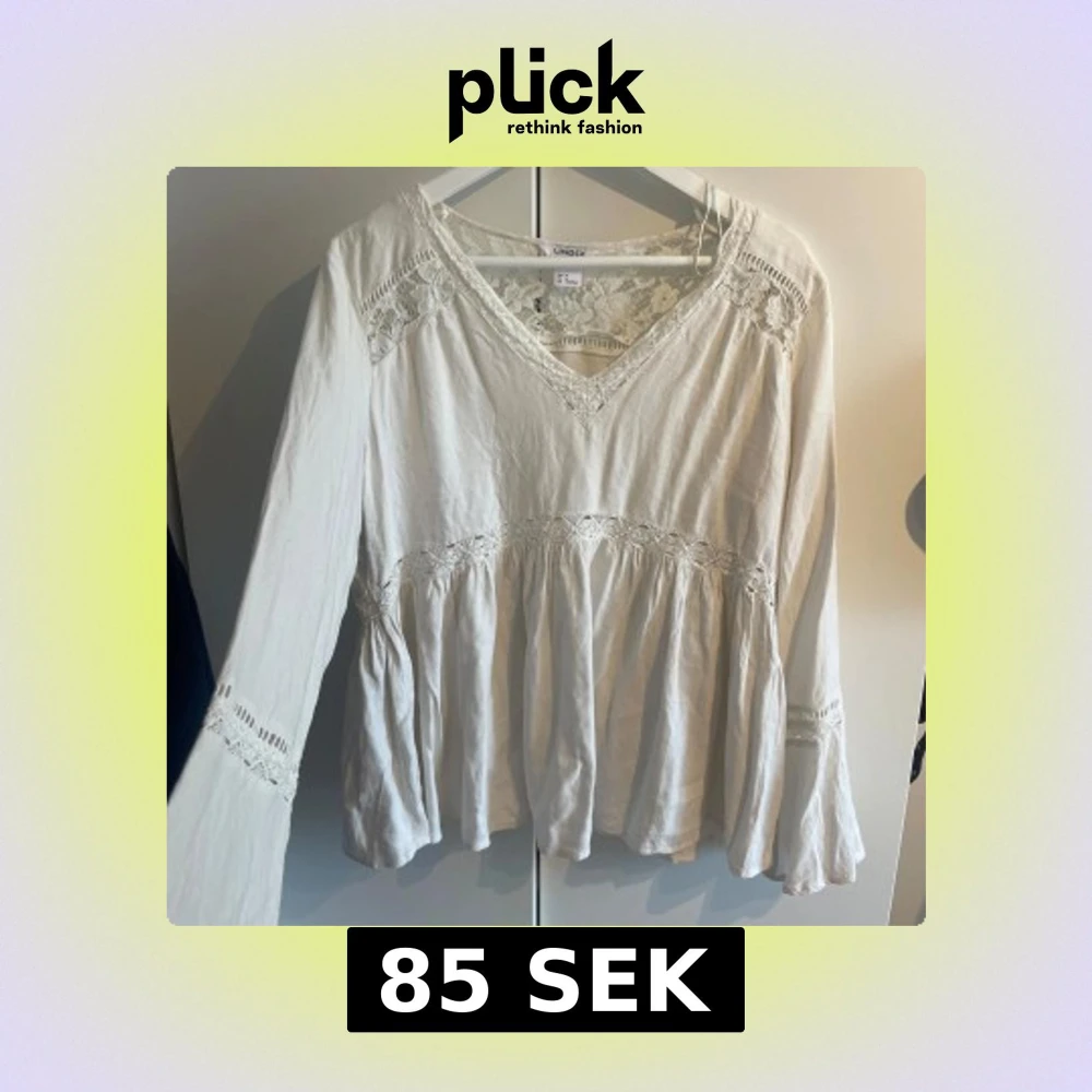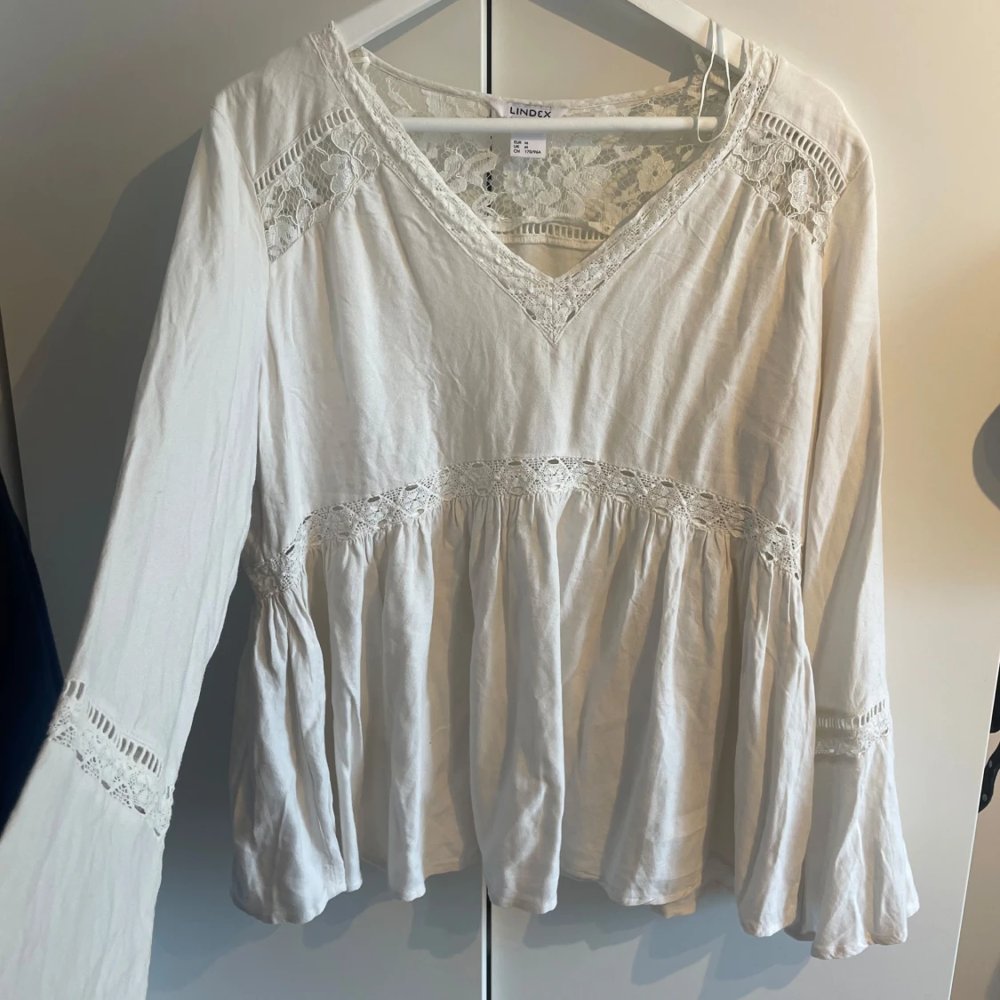 Boho blus. Superfin vit blus från Lindex med v-ringning och spetsdetaljer vid axlar, ärmslut och midja. Blusen har långärmade, lite utsvängda ärmar och ett luftigt, flowy fall. Perfekt för dig som gillar bohemisk stil.