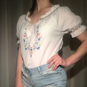 Supersöt vit plus med blomdetaljer, storlek XS men passar även S. Säljer endast pga inte min stil. Aldrig använd. Tunt svalt material (80% trevira, 20% bomull), något genomskinligt men inte mer än vad som syns på bilderna. Färgen stämmer bäst överens med de två första bilderna:) Frakt tillkommer. Jag garanterar en snabb och pålitlig affär! Sampackar gärna om du köper något mer🥰