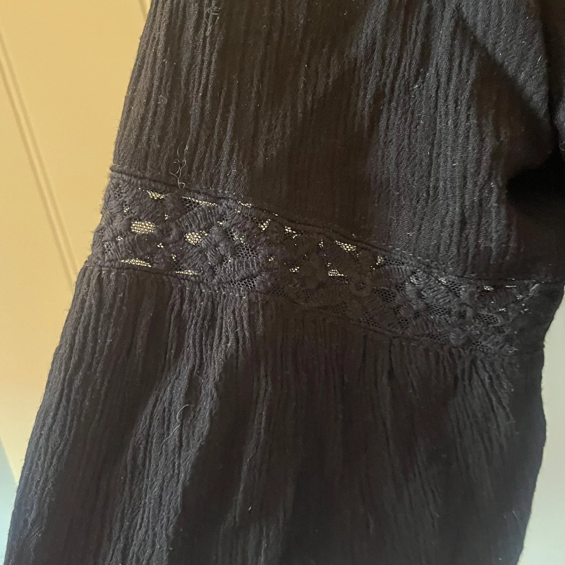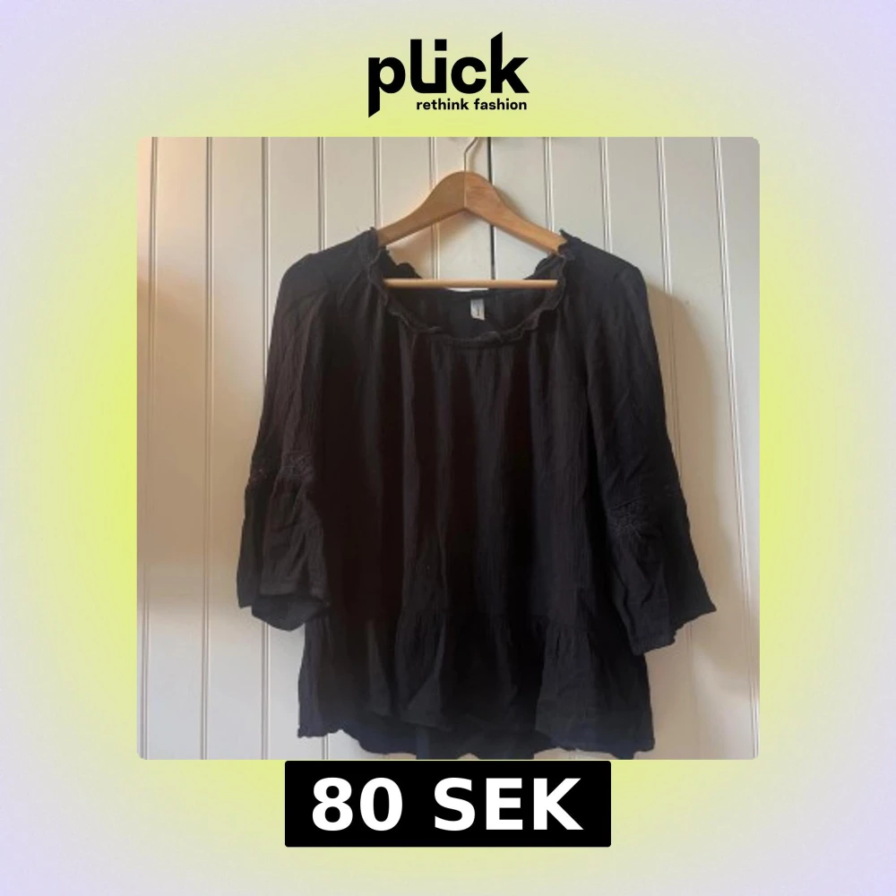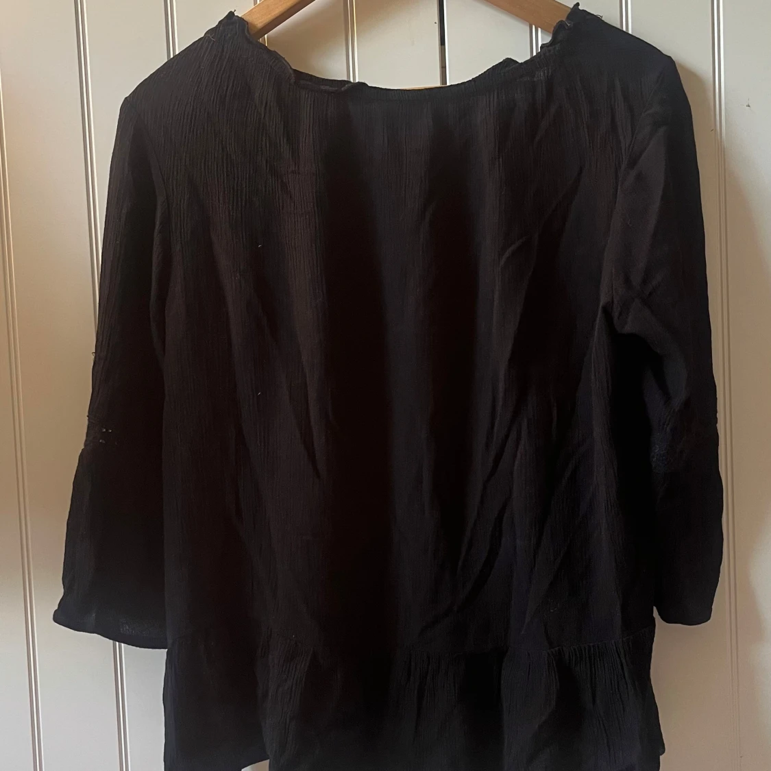 Svart lite kortare blus från Soyaconcept med trekvartsärmar och volangdetaljer🥰Blusen har en lös passform och är tillverkad i ett lätt, krinklat bomullstyg. Ärmarna har inslag av spets som ger en extra touch. Perfekt för dig som gillar en chill och bohemisk vibe!🙏🏻💞