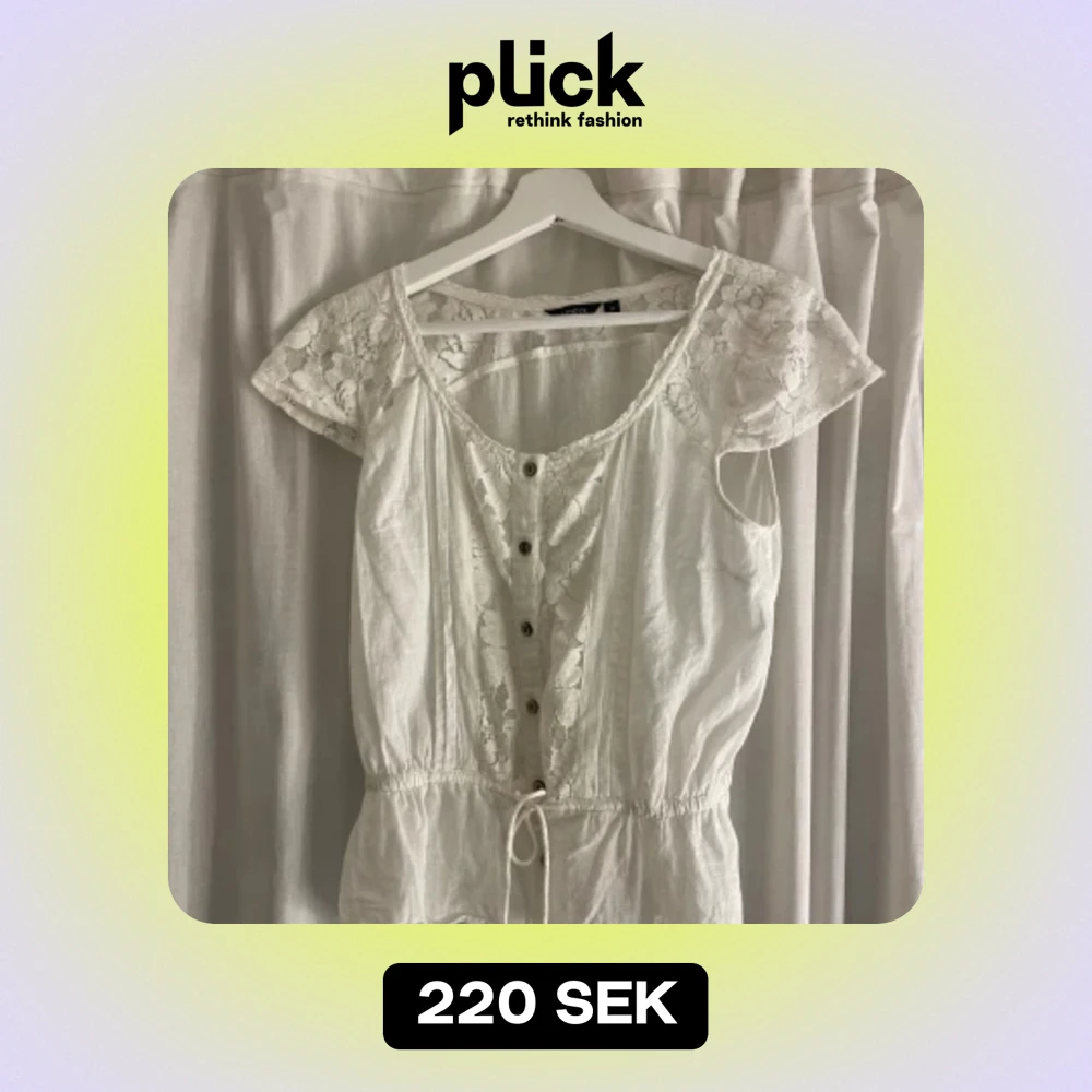 En vit topp från Lindex med spetsdetaljer på ärmarna och längs med knäppningen framtill. toppen har korta ärmar och en knytning i midjan för en justerbar passform. Den är dekorerad med knappar framtill.