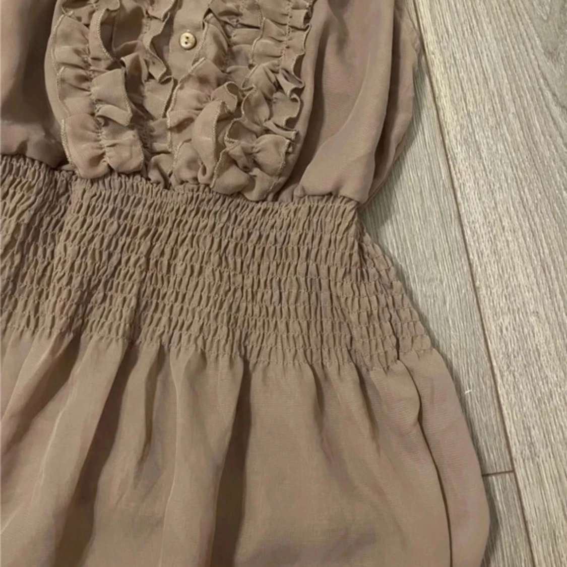 Säljer en söt beige ärmlös topp med volangdetaljer framtill och knappar. Toppen har en smockad midja som ger en fin passform. Perfekt för varma dagar!