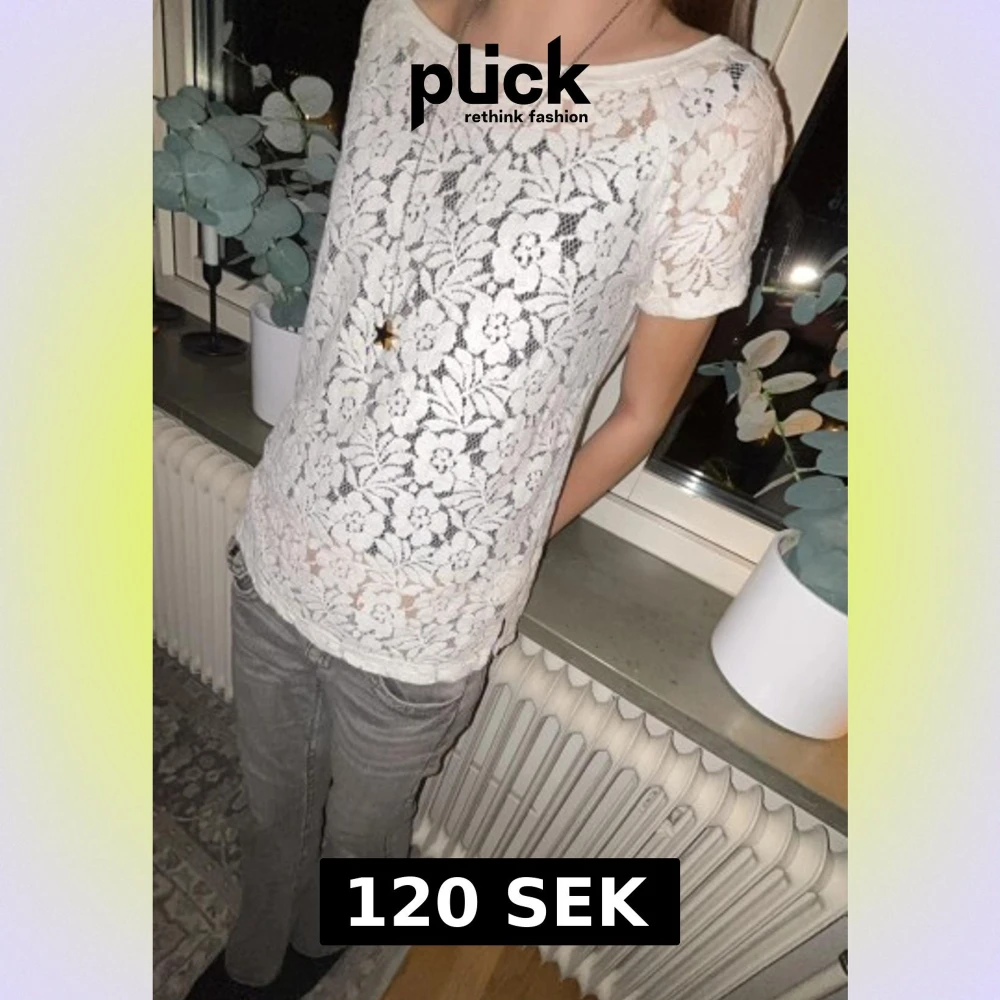 Säljer en vit blus med blommigt spetsmönster och korta ärmar. Toppen har rund hals och är lätt transparent tack vare det tunna spetsmaterialet. Perfekt för dig som gillar romantisk och feminin stil. Superfin att matcha med smycken och jeans.
