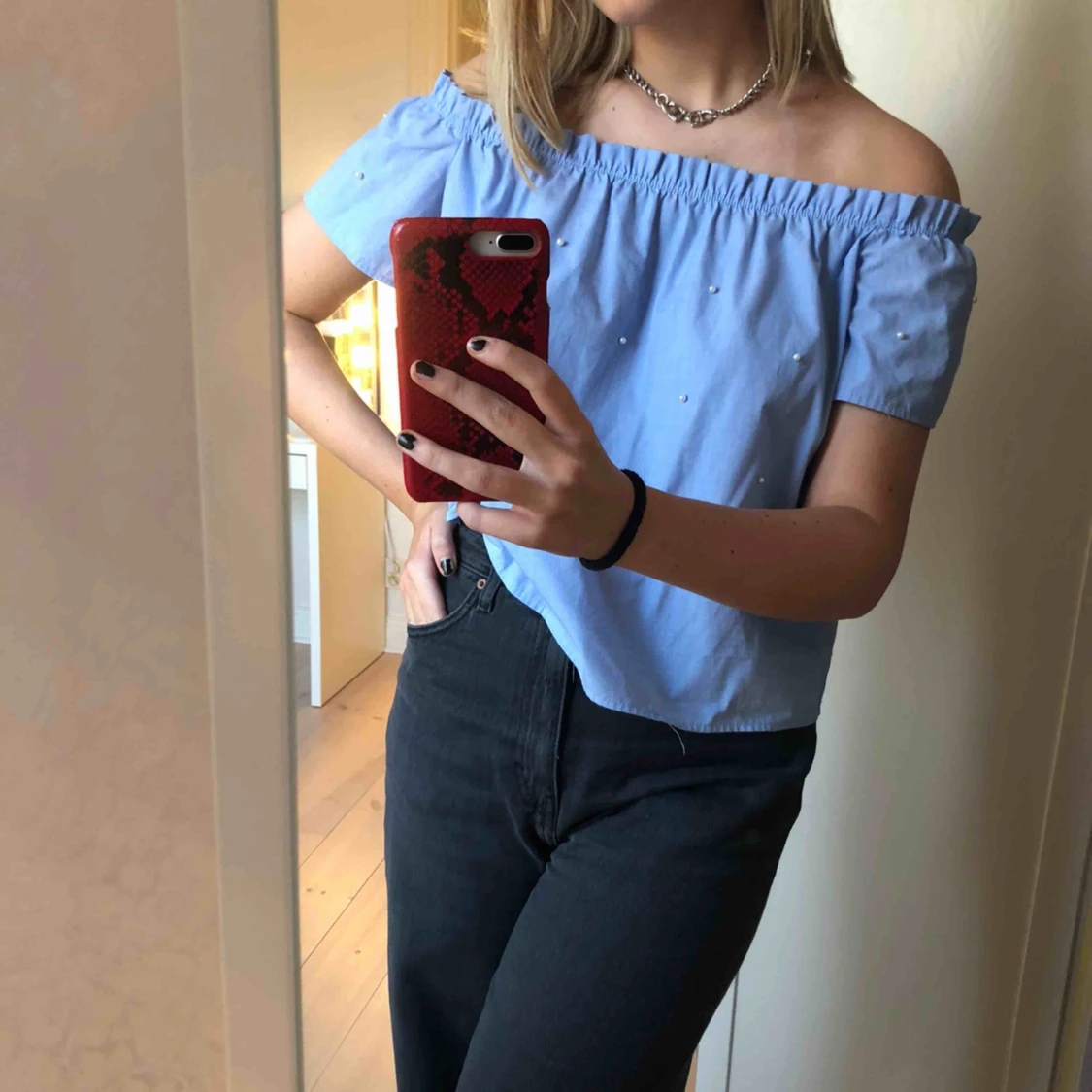 Så fin off-shoulder blus med pärlor på från Stradivarius i storlek M.💕