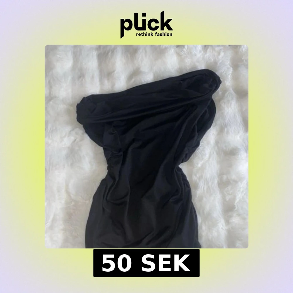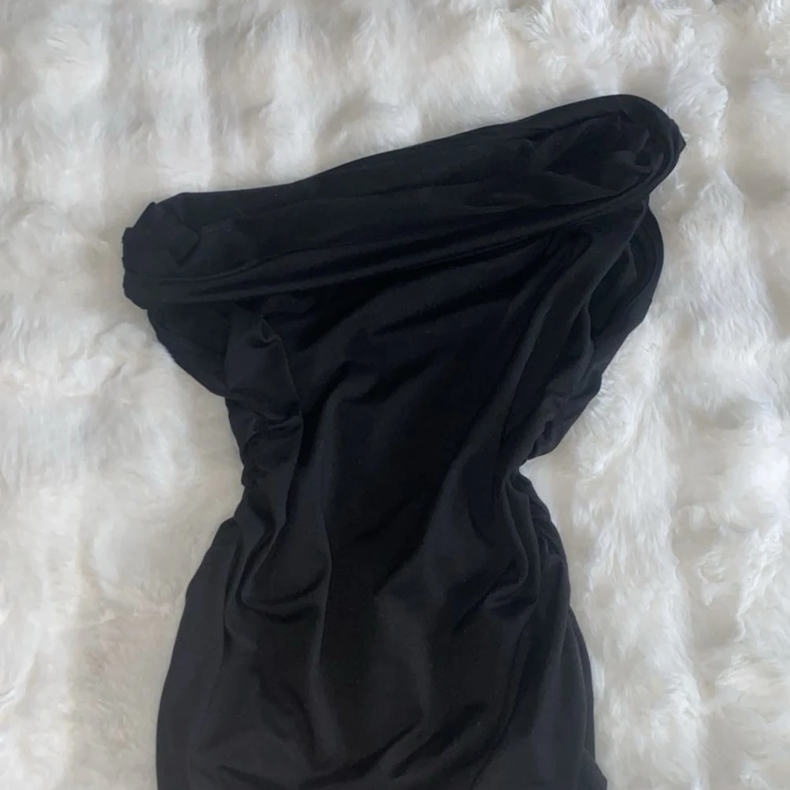 Snygg svart axelbandslös topp med draperad design och figurnära passform. Perfekt för dig som vill sticka ut med en elegant och stilren look. Mjuk och följsam känsla i materialet.