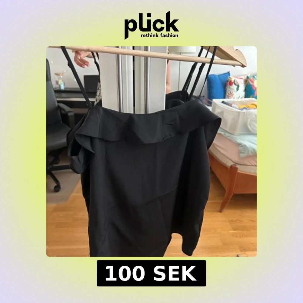 Snygg svart kort klänning från H&M med axelbandslös design och volang upptill. Perfekt för dig som gillar en stilren look med en twist. Klänningen har smala axelband och en enkel, rak passform. Materialet känns lätt och bekvämt.