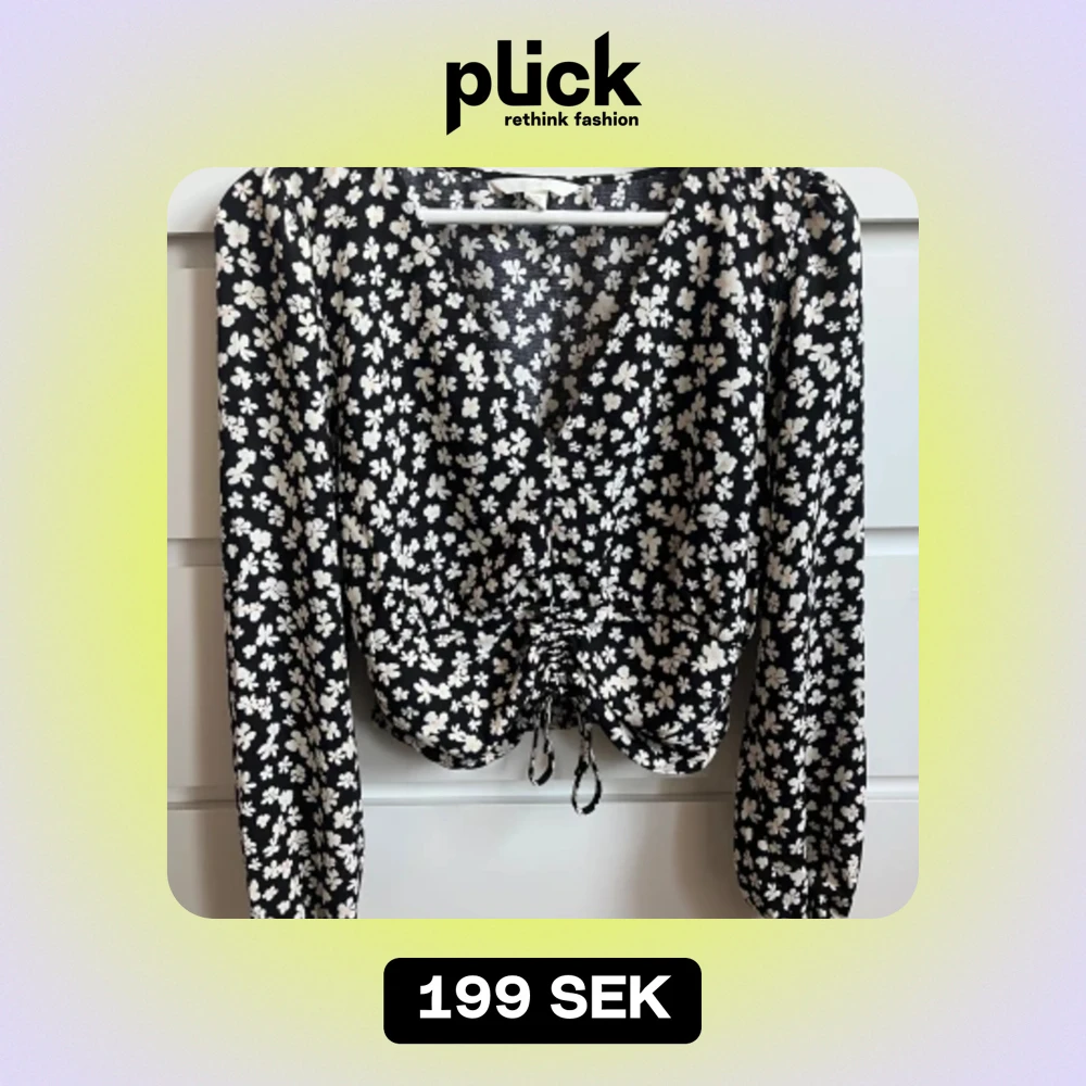 Svart blus med vita blommor från HM. Aldrig använd men har tagit bort lappen. Har aldrig använt den då jag inte tycker att den sitter bra på mig då den är lite stor vid bysten för mig. Storlek S. Nypris 399 säljer för 199. Kan dock diskutera pris.