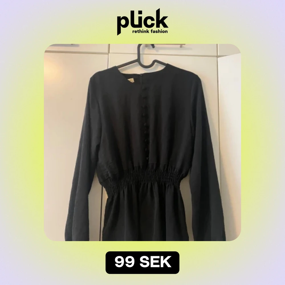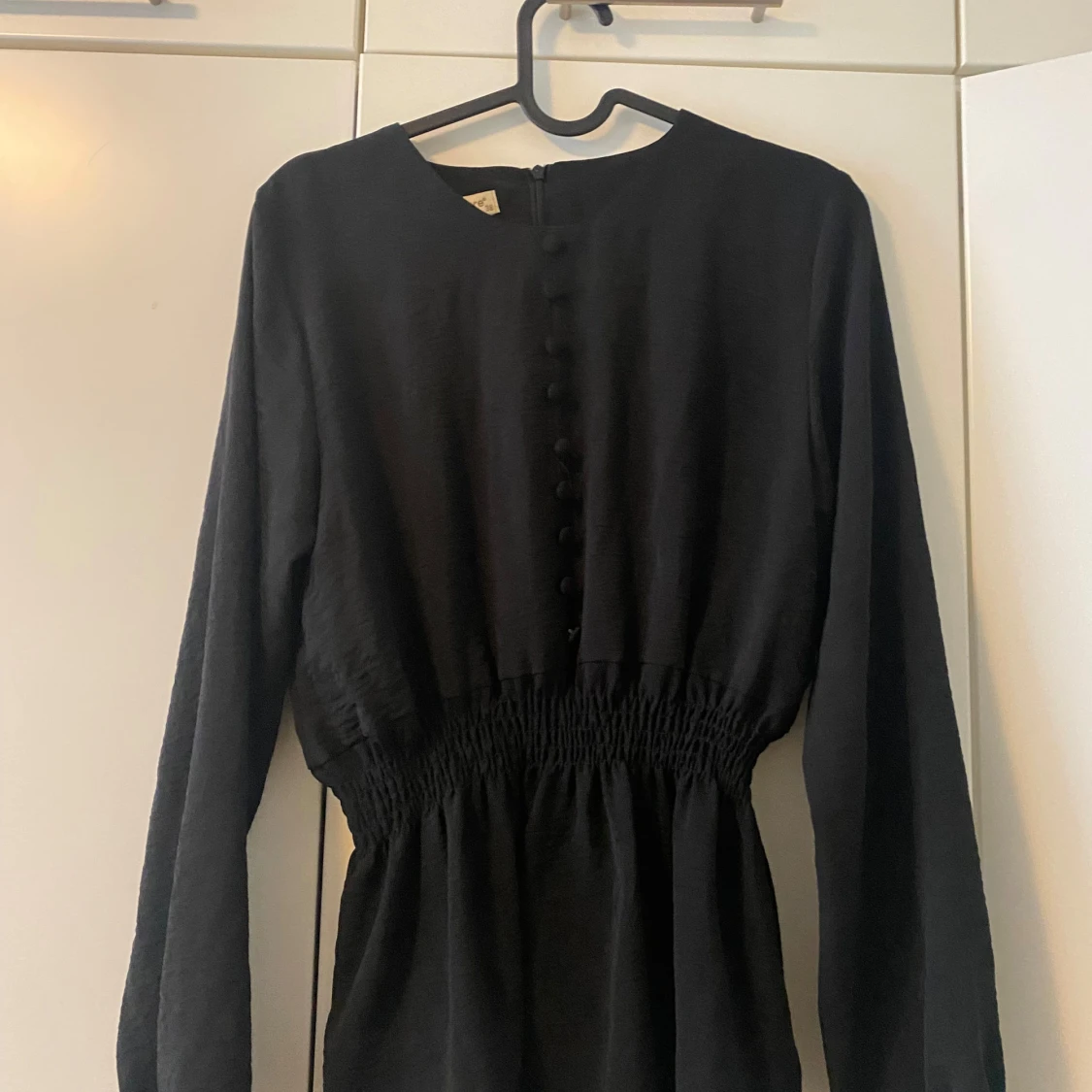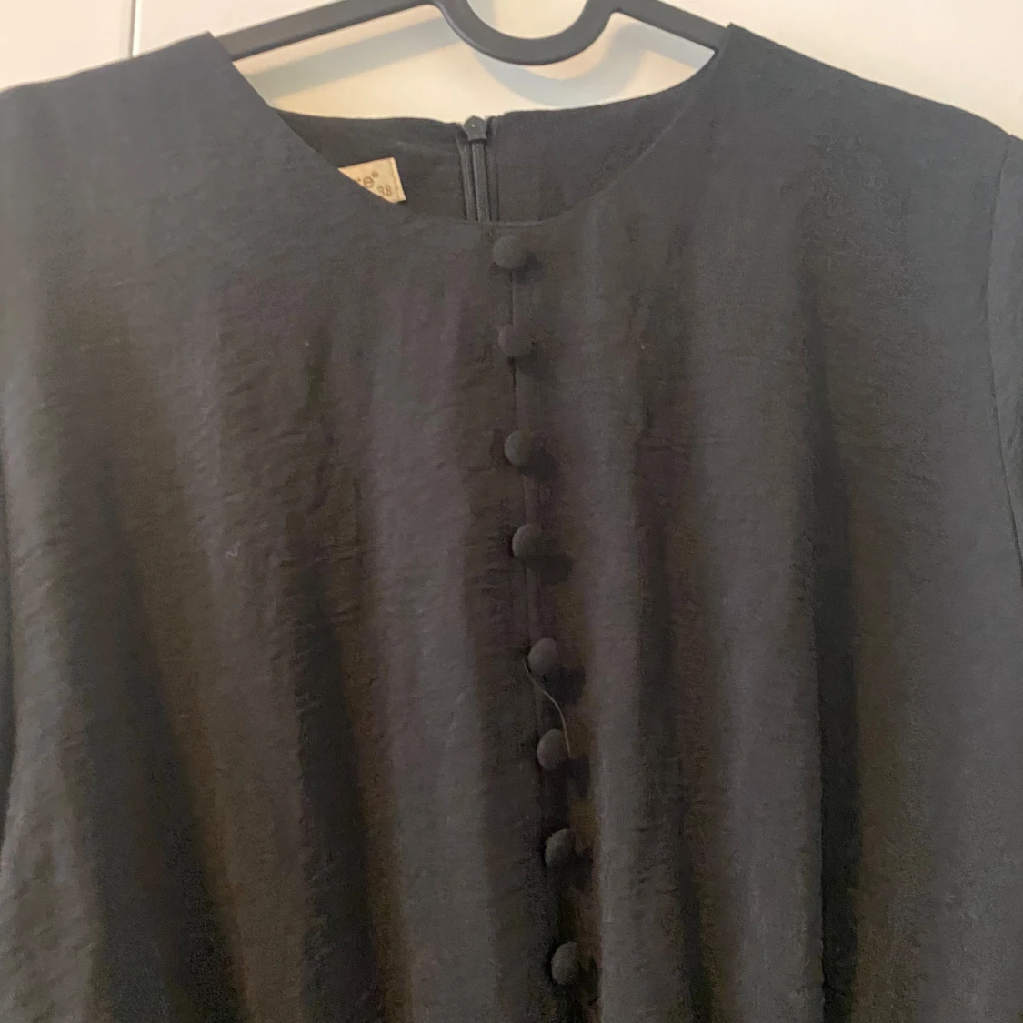 En svart slät blus med en dragkedja bakom ryggen och små detaljer från bröstet till midjan. Den är mellan lång blus som sitter vid midjan och som är löst nedåt