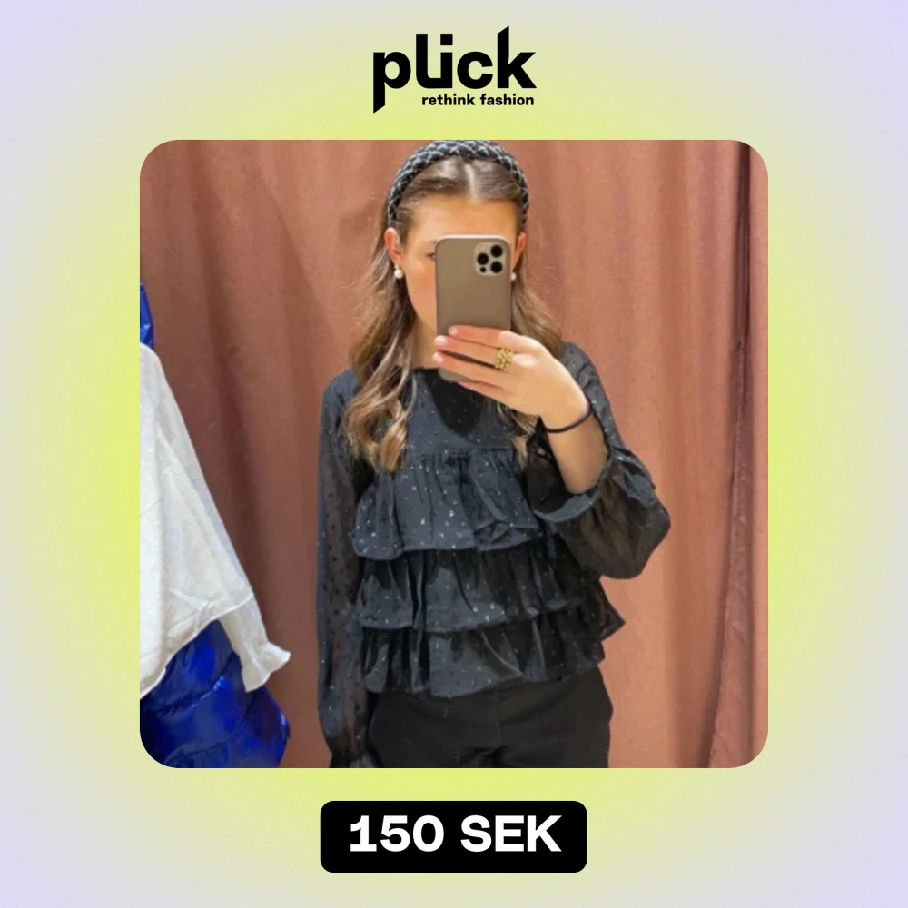 En svart lite glittrig blus med volang o vida armar frĂ„n Gina Young!! Superfin o vĂ€ldigt bra skick, endast anvĂ€nd en gĂ„ng đ€