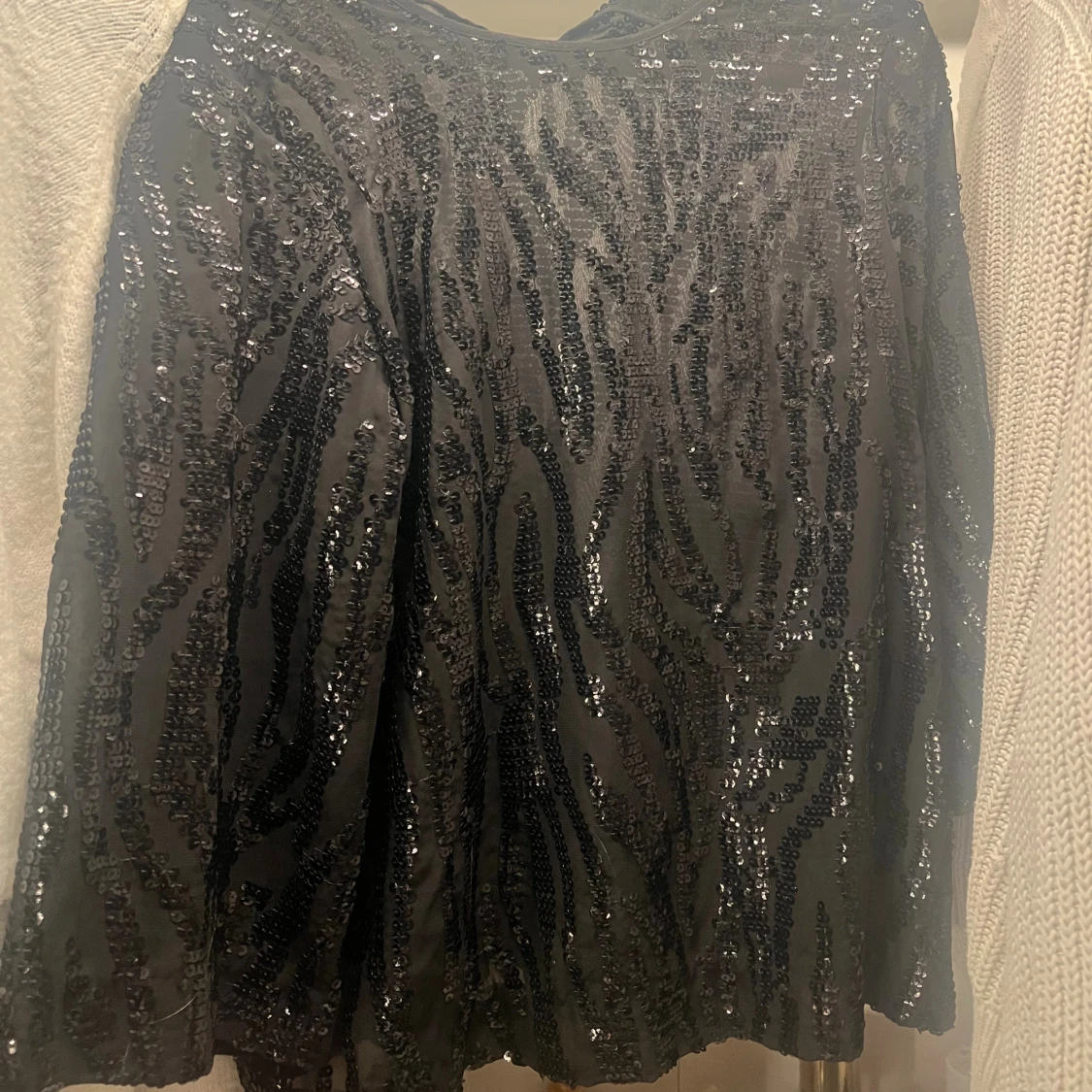 Säljer en svart blus med glittrigt zebramönster i paljetter. blusen har en lätt utsvängd form och är perfekt för dig som vill sticka ut med en cool och trendig look. Materialet känns mjukt och följsamt mot kroppen.