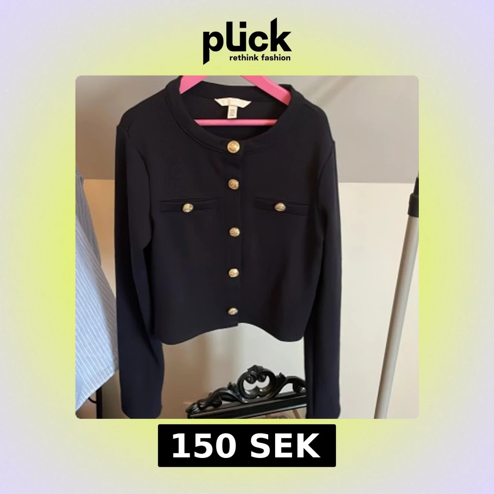 Stilren svart kavajjacka från H&M med dekorativa guldknappar framtill och vid fickorna. Jackan är croppad och har lång ärm, perfekt för en dressad look. Klassisk rund halsringning och snygga detaljer. Aldrig använd💞