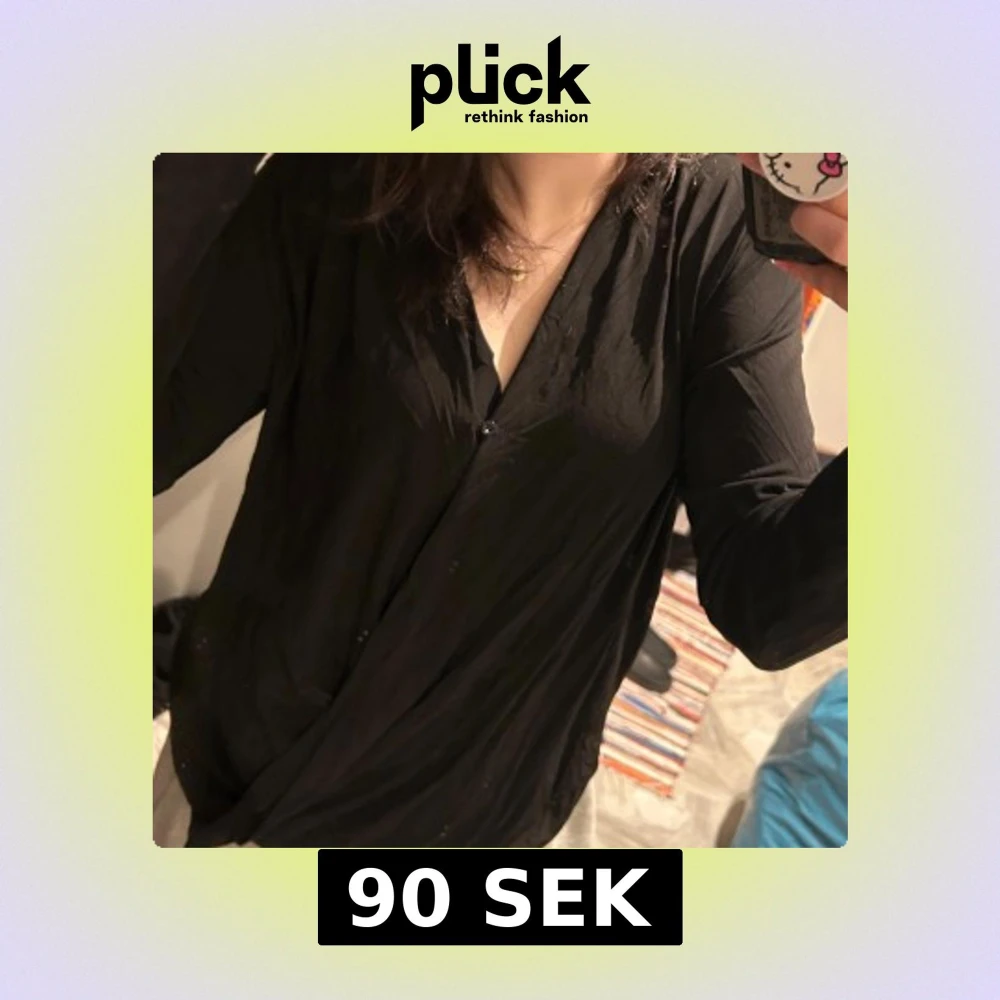 Säljer en svart långärmad blus med v-ringning då den är för stor för mig. Blusen har en loose passform och är i storlek L💕