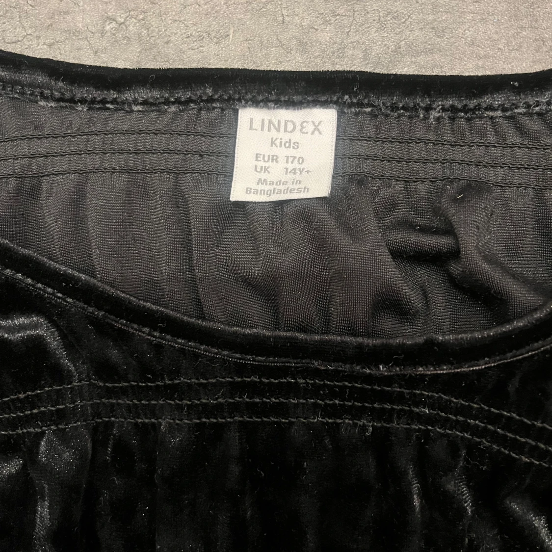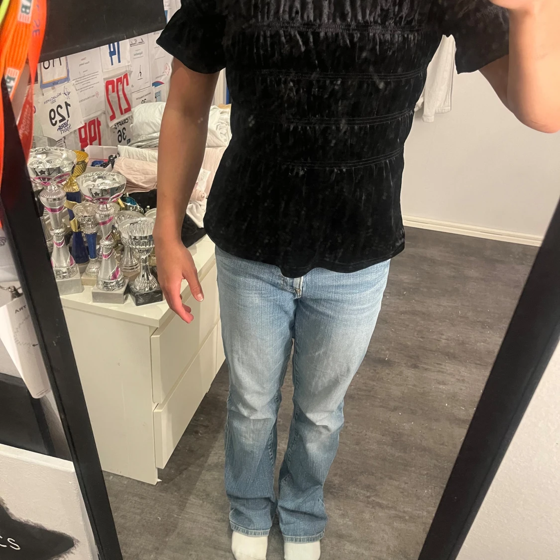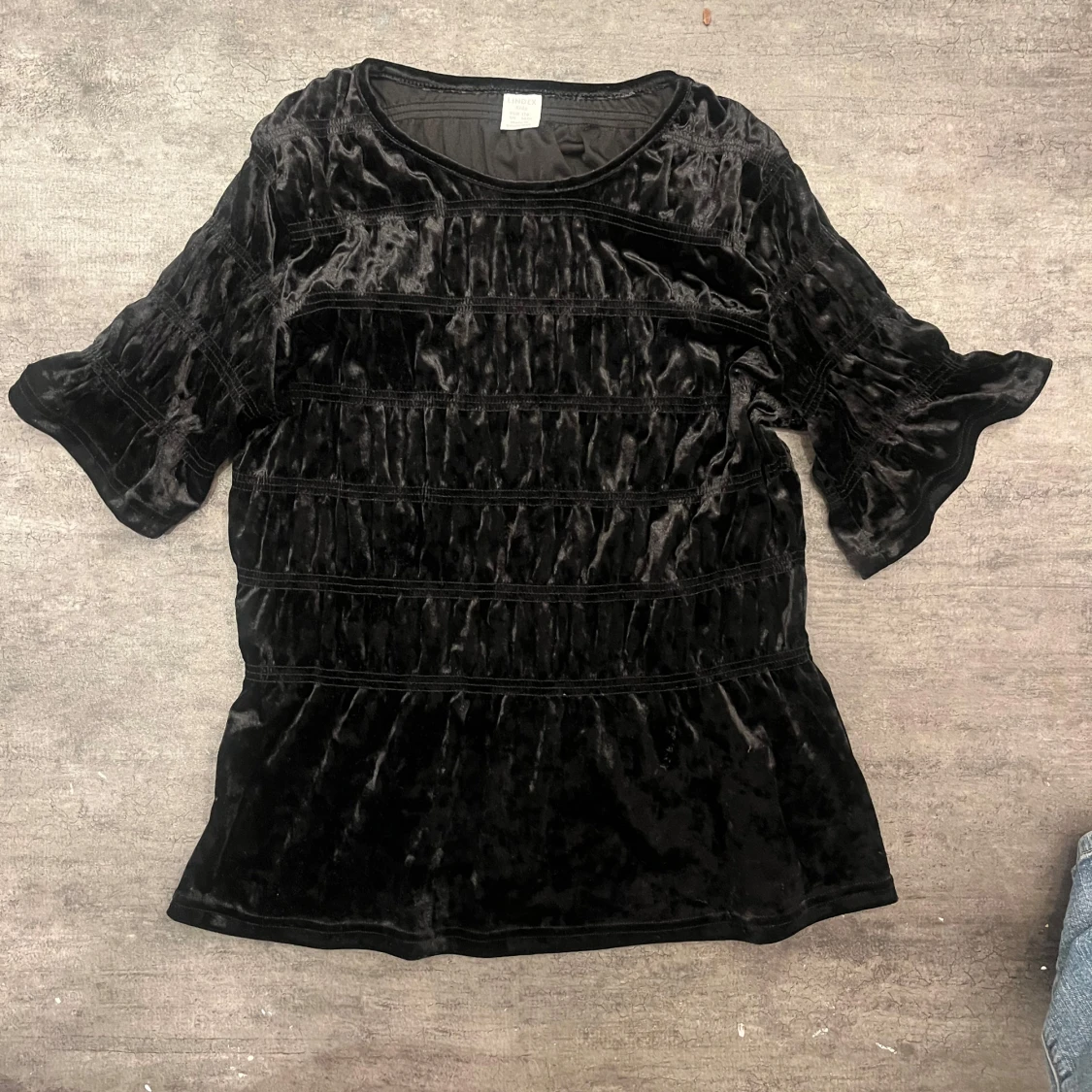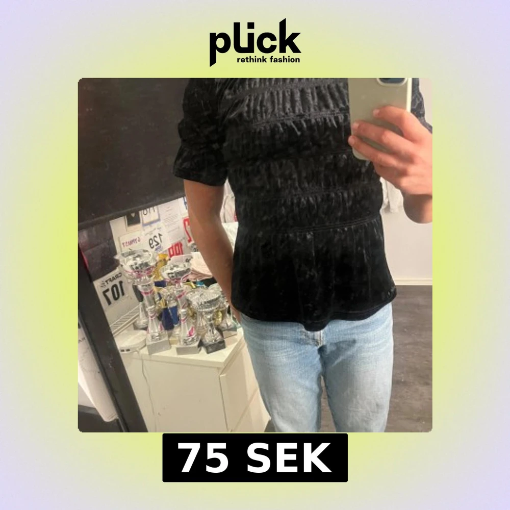 Säljer en svart sammetsblus från Lindex med korta ärmar och lätt puffig form. Blusen har en rund halsringning och fina sömdetaljer som ger struktur. Perfekt för dig som gillar en mjuk och glansig känsla i materialet.