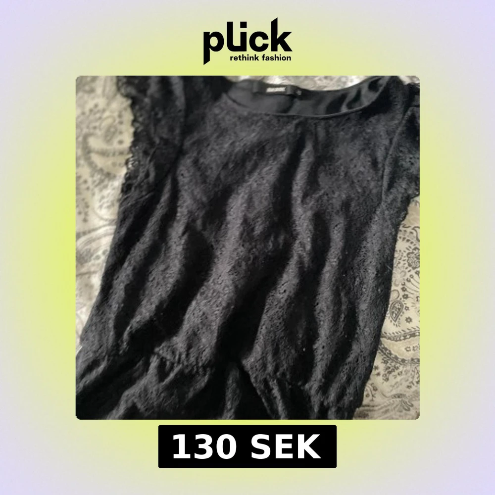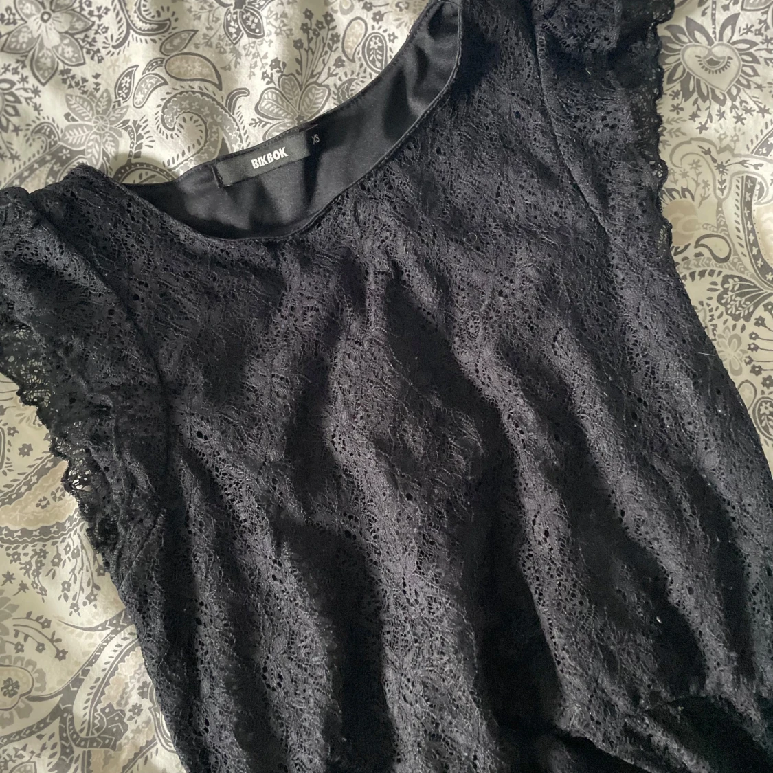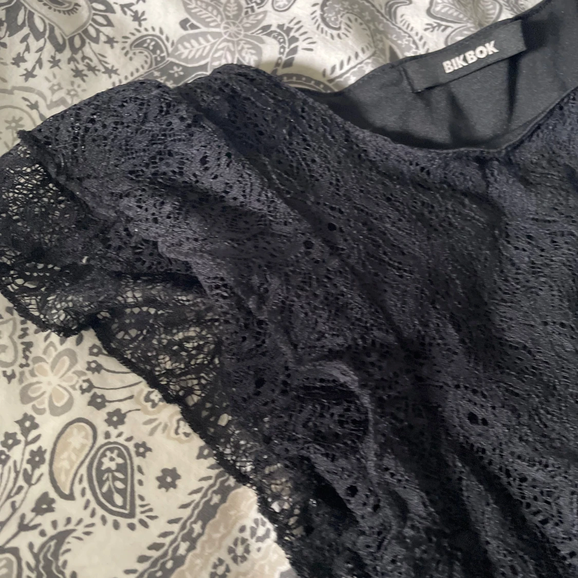Supersöt svart topp från Bik Bok i spetsmaterial. Korta ärmar med volangdetaljer och rund halsringning. 🩷