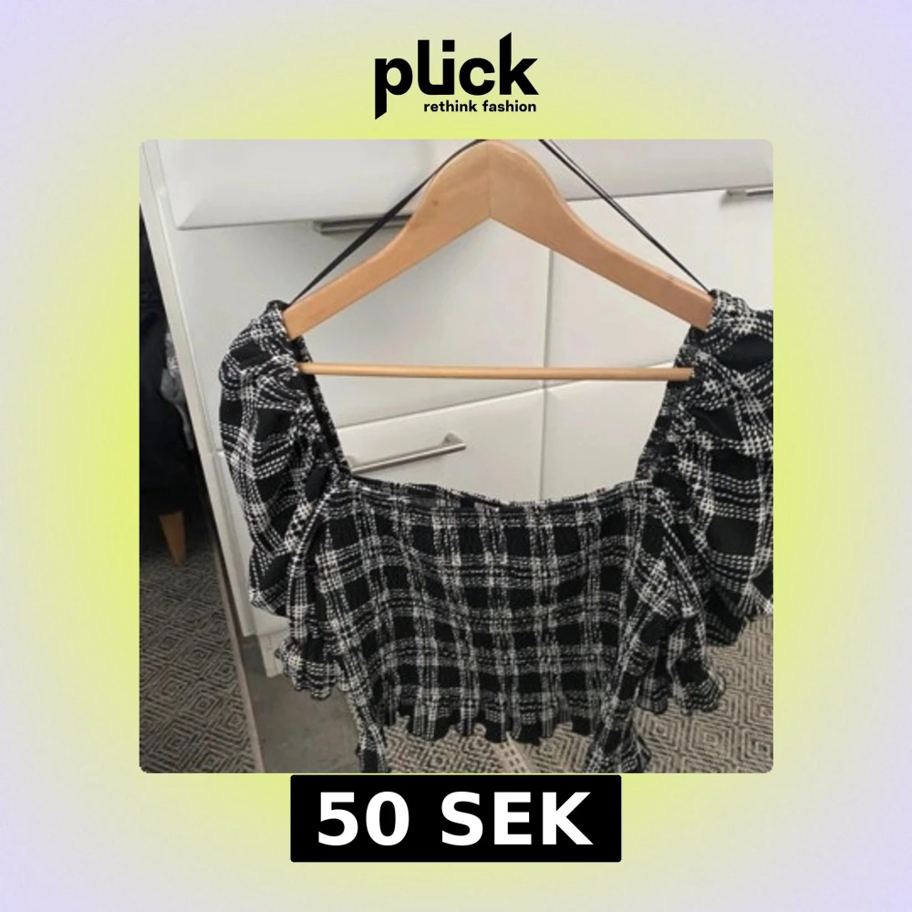 Trendig croppad topp från BikBok i svartvitt rutigt mönster. Toppen har puffiga långa ärmar och smockad resår vid midjan och ärmsluten. Perfekt för att skapa en cool och stilren look.