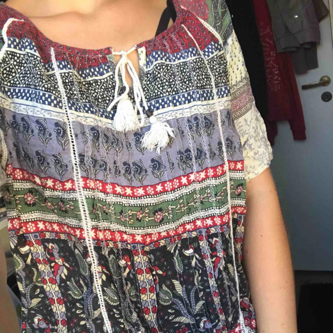 Superfin blus med mönster och ”tofsar” framtill som går att knyta. Endast provad, strl S😊