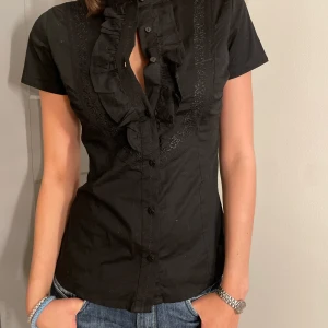 Super söt och annorlunda kortärmad skjorta med volang och broderiet detaljering. Går att ha både i skolan men också på lite roligare event. Storlek S-M. Mycket bra skick. Köpare står för frakt!