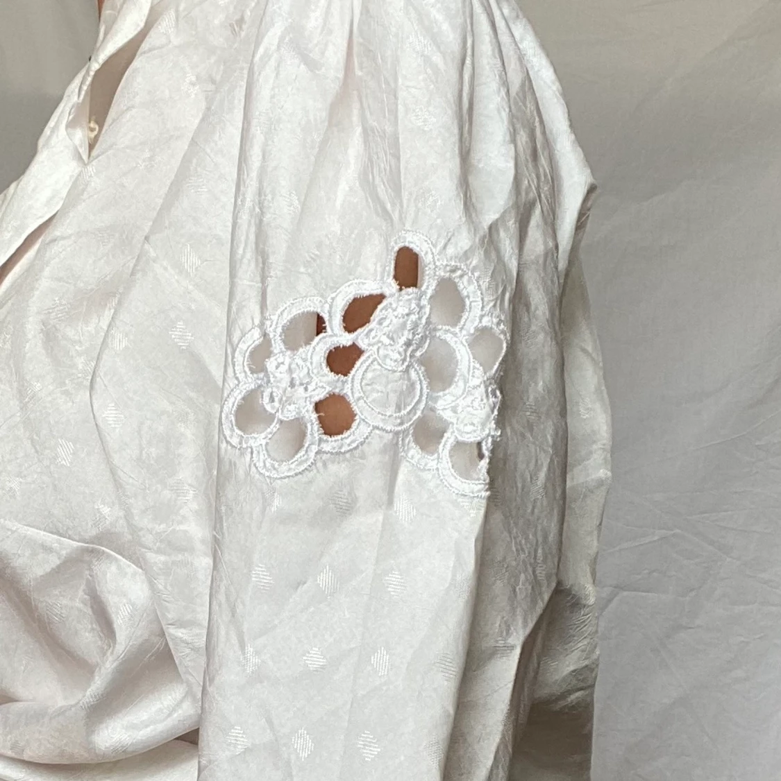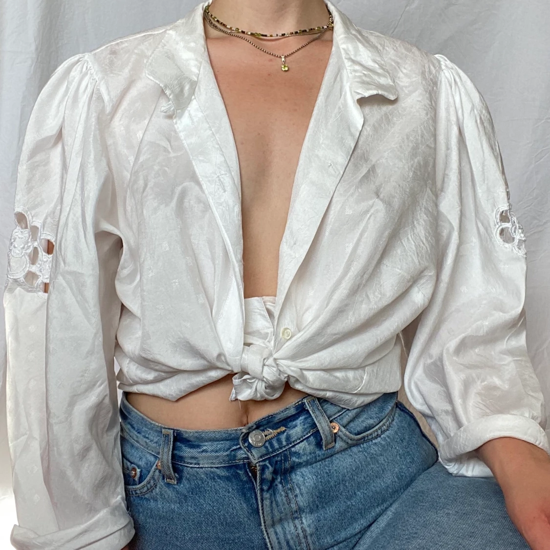 Otroligt fin blus, fin knuten men även över ett linne. Den är köpt 2nd hand och är ganska stor i storleken så passar från s till l skulle jag säga