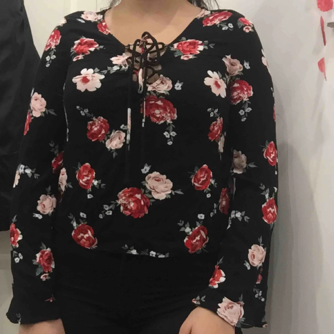 Riktigt skön samt snygg tröja med fina blommor, perfekt nu när våren närmar sig! Den har som en urringning med snören som man kan ”justera”. Den har även som jättesmal flärp längst ned på slutet av armarna vid händerna.