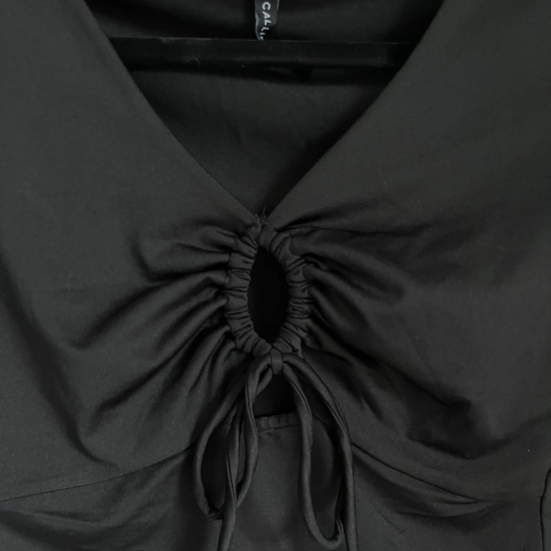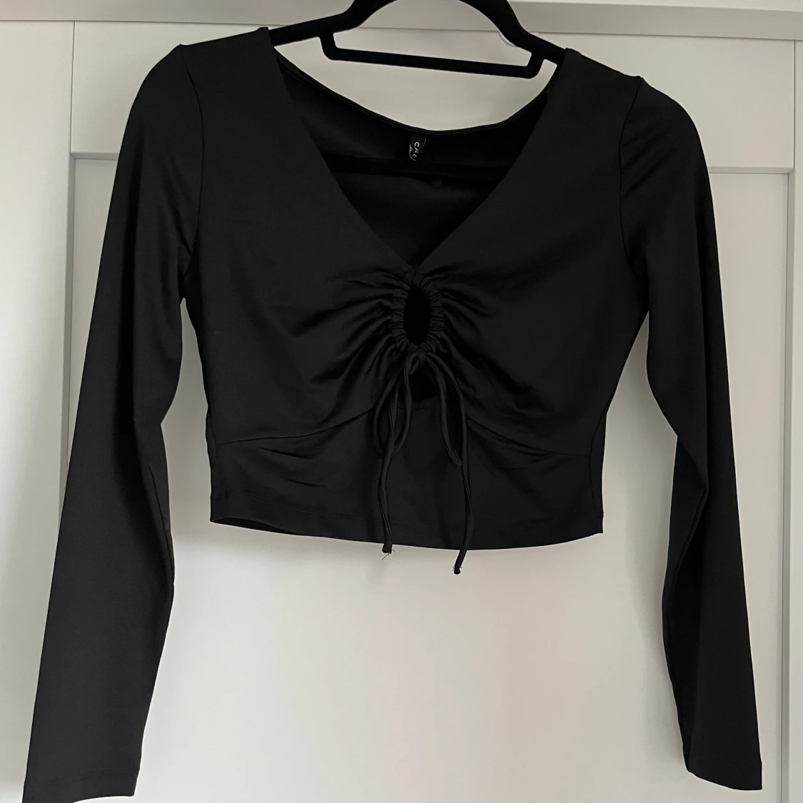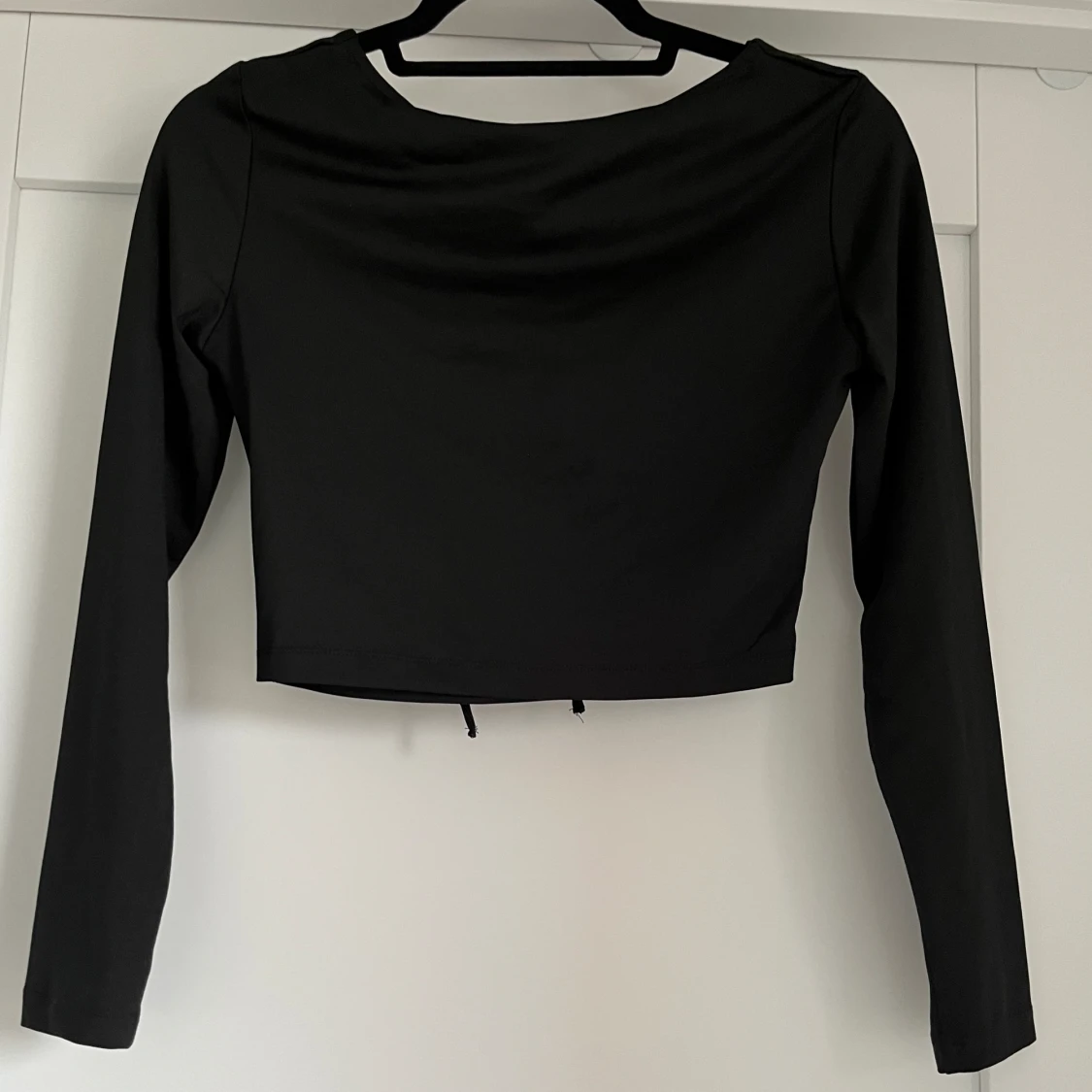 Svart långärmad tröja med öppen urringning, går att justera öppningen med banden. Köpt utomlands och har endast använt 2 gånger.