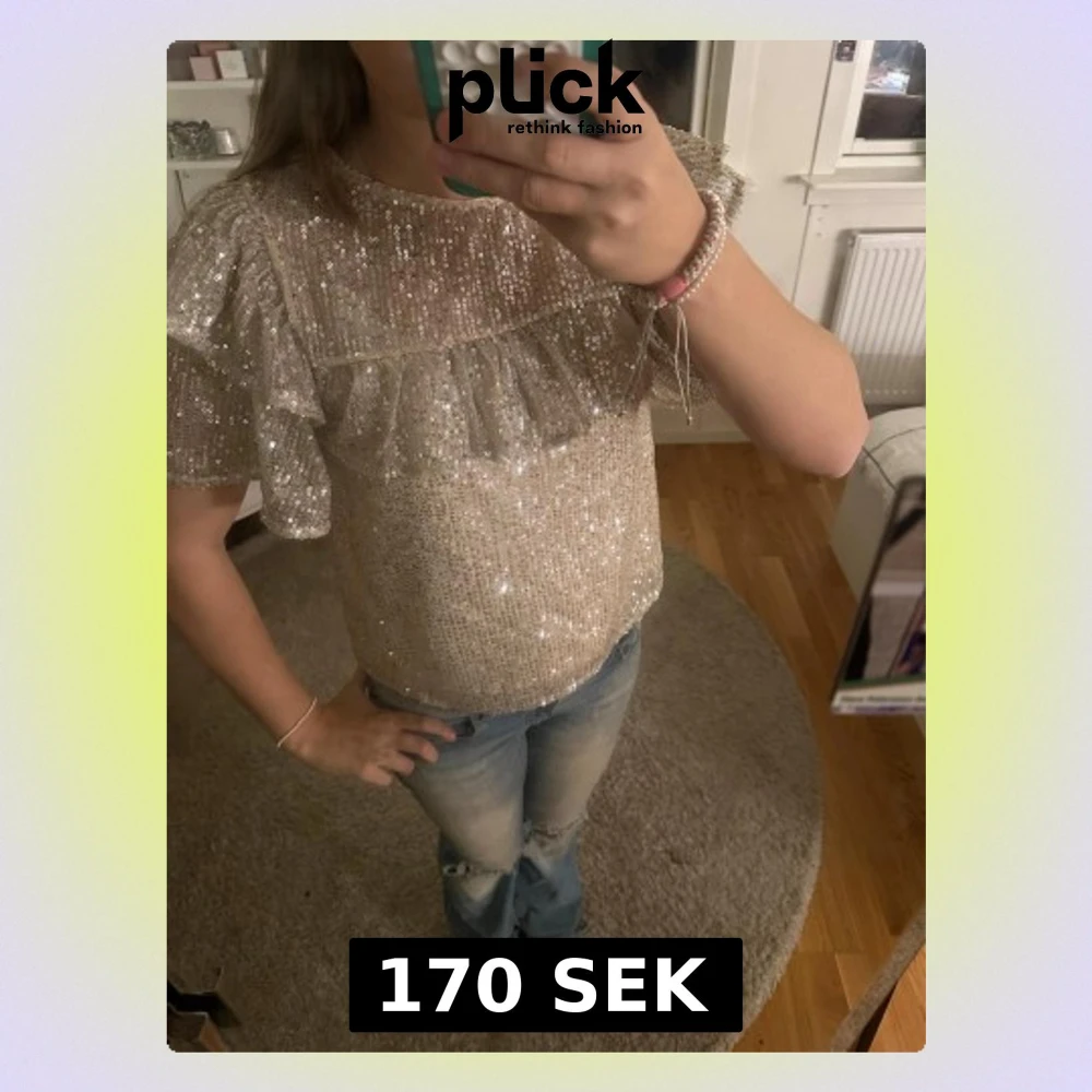 Champagnefärgad blus från Lindex med glittriga paljetter över hela toppen. Blusen har korta, voluminösa ärmar och en bred volang framtill. Materialet är syntet och toppen har en rund halsringning. Perfekt för dig som vill sticka ut med extra glitter.